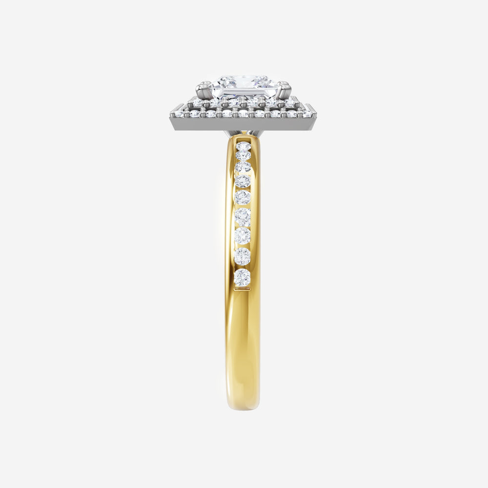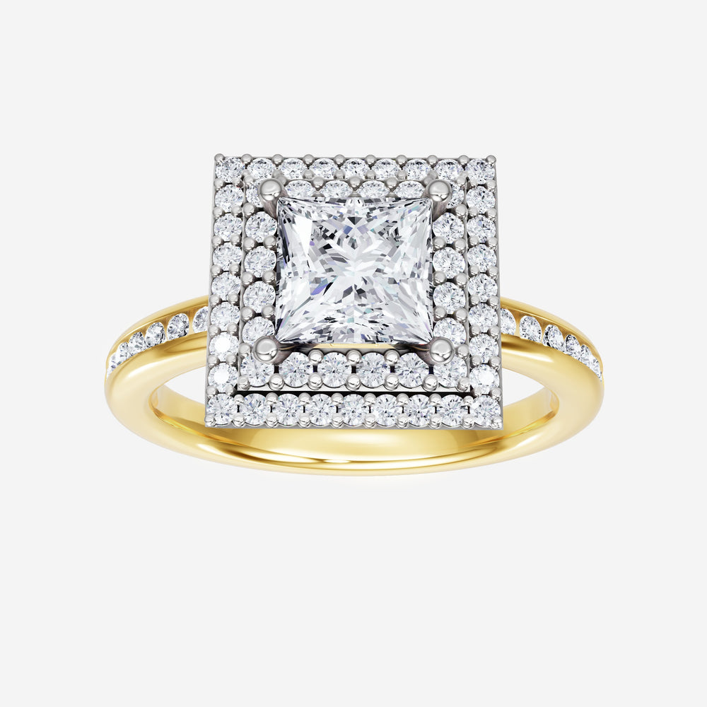 You’ve designed a ring that reflects lasting elegance and grace! Crafted from 18k Yellow White Dual Tone, this exquisite Princess lab-grown diamond is the centerpiece of this unique design. This Channel Set Shank with a Double Halo head showcases the brilliance of the Princess diamond, creating a timeless look. This stunning ring makes the perfect symbol of everlasting love and devotion.