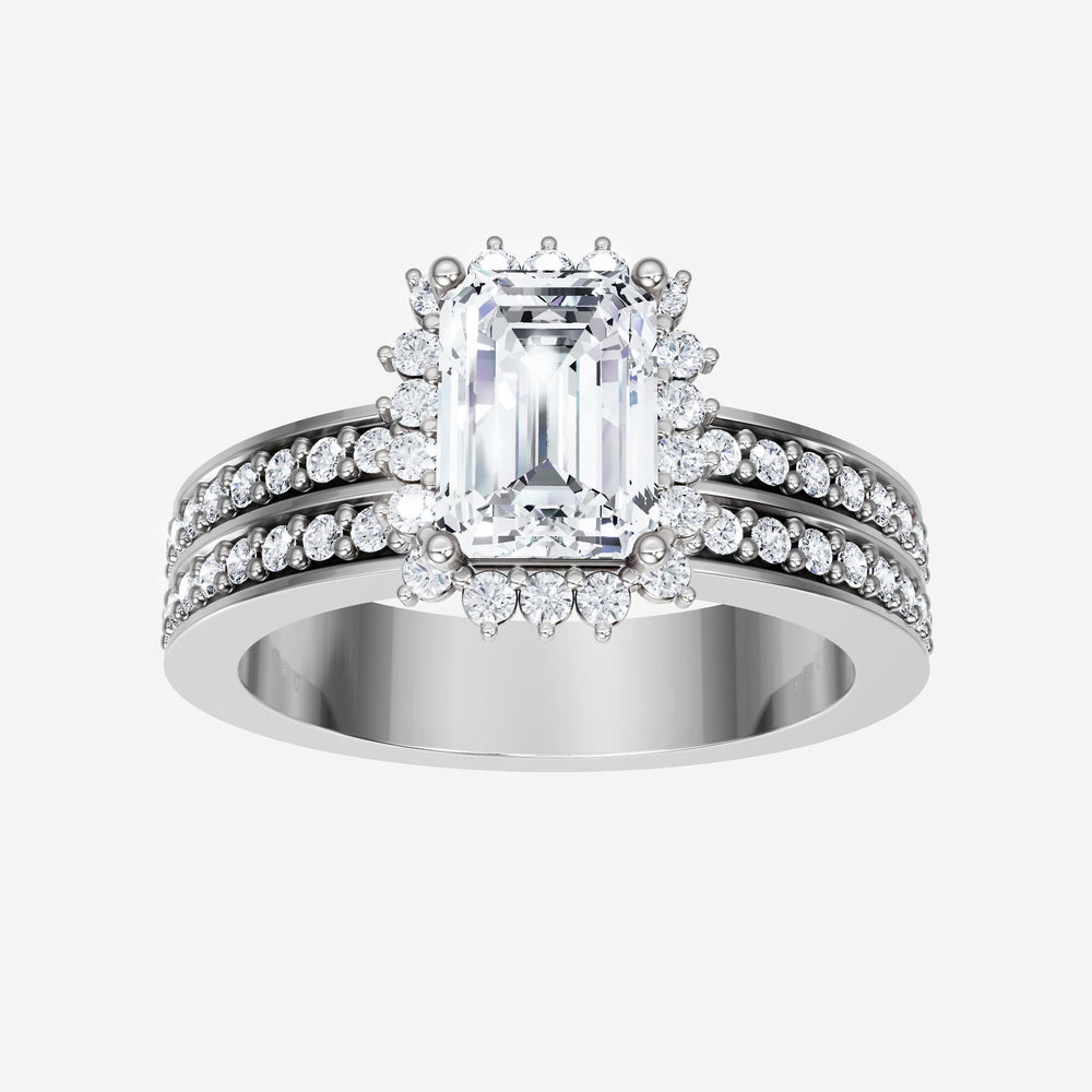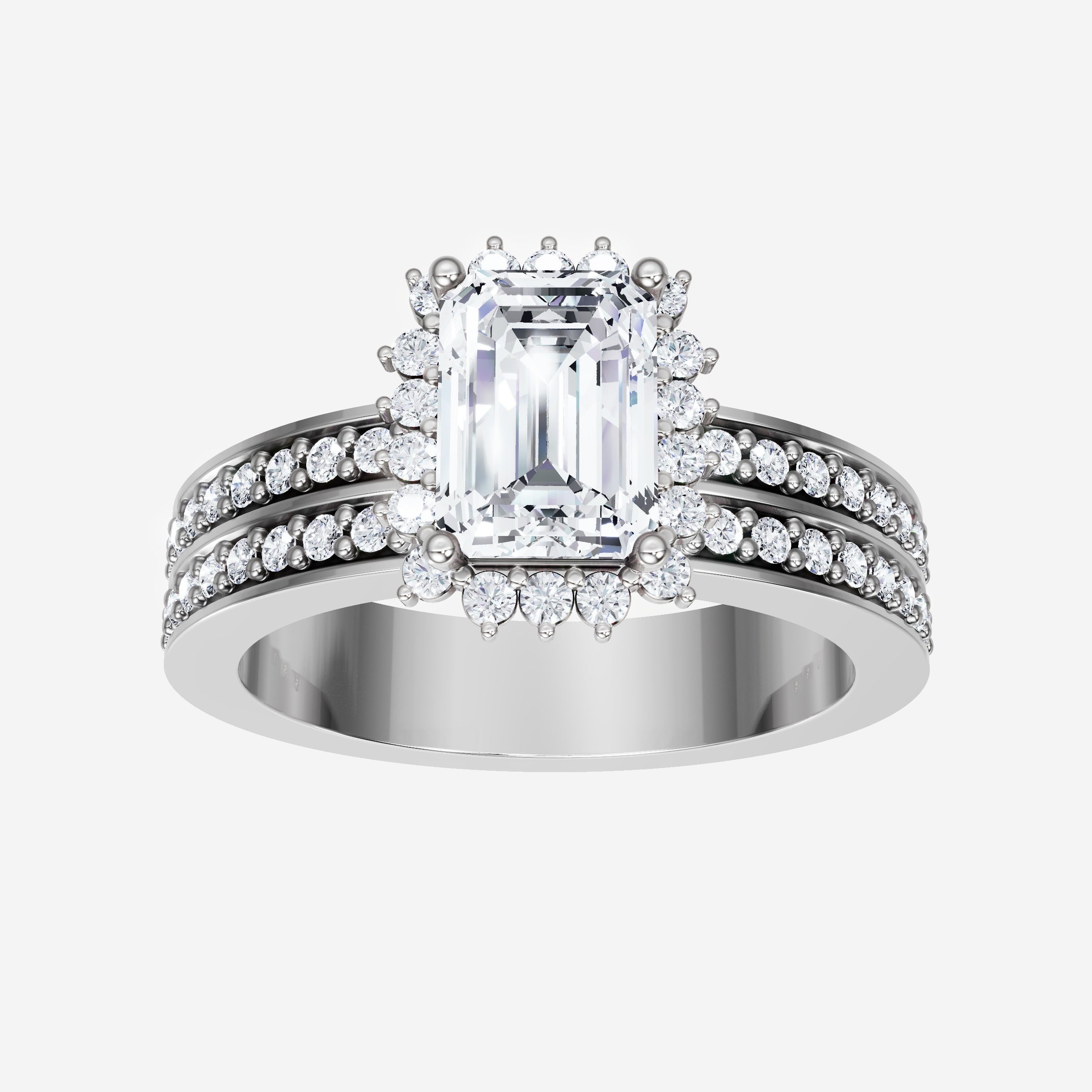 You’ve designed a ring that reflects lasting elegance and grace! Crafted from 950 Platinum, this exquisite Emerald lab-grown diamond is the centerpiece of this unique design. This Double Row Pave with a Diana Halo head showcases the brilliance of the Emerald diamond, creating a timeless look. This stunning ring makes the perfect symbol of everlasting love and devotion.