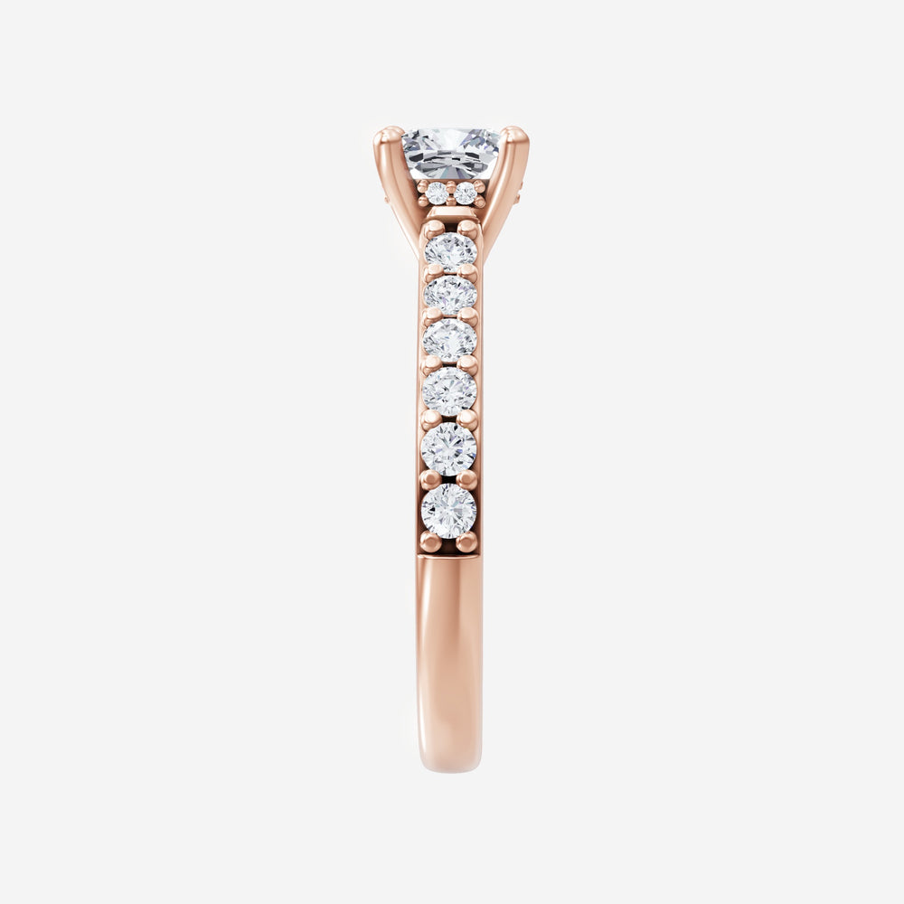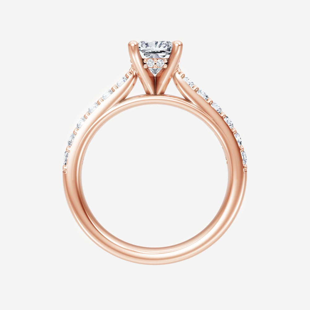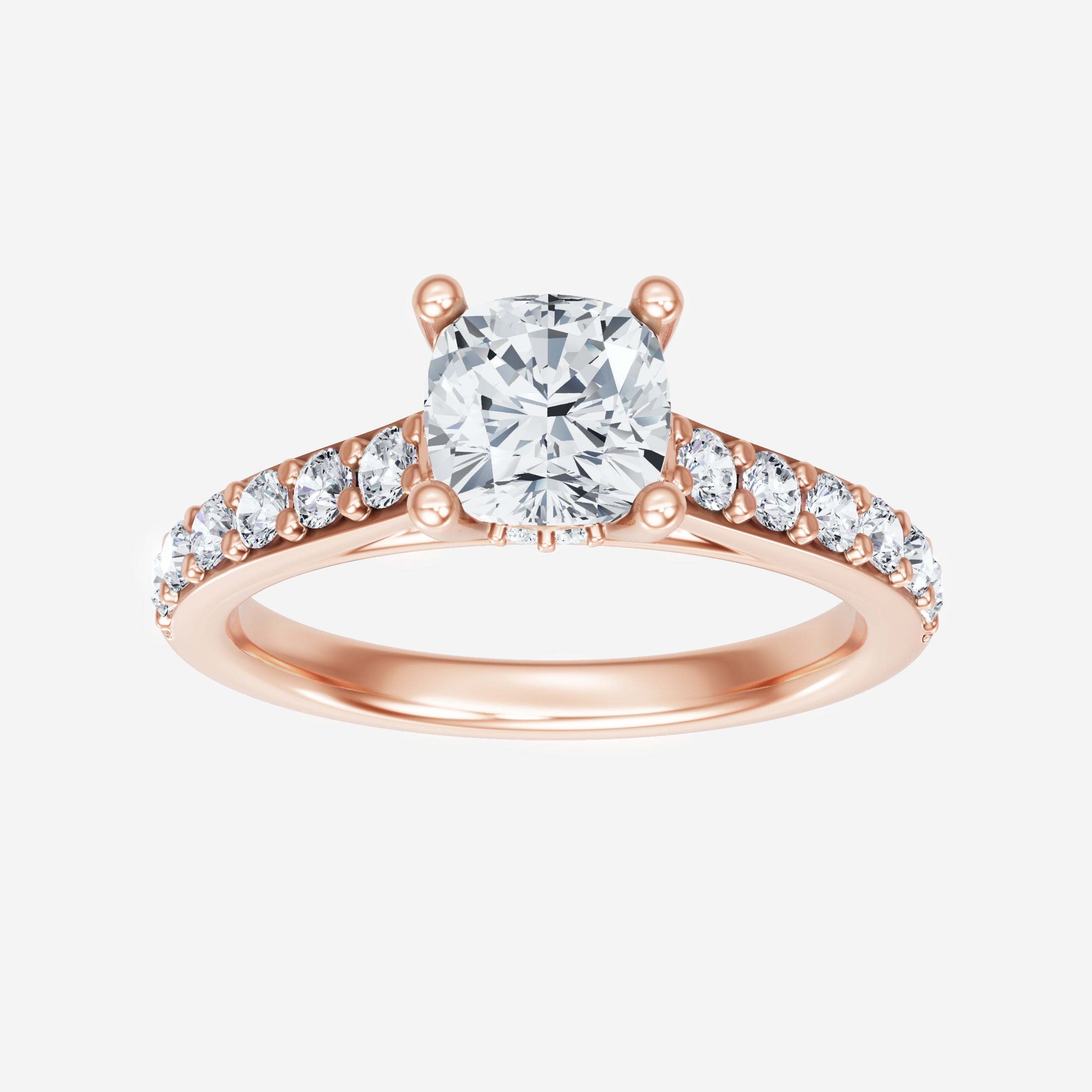 You’ve designed a ring that reflects lasting elegance and grace! Crafted from 14k Rose Gold, this exquisite Cushion lab-grown diamond is the centerpiece of this unique design. This Cathedral Diamond Shank with a Hidden Halo head showcases the brilliance of the Cushion diamond, creating a timeless look. This elegant piece is the perfect symbol of love, strength, and timeless beauty.