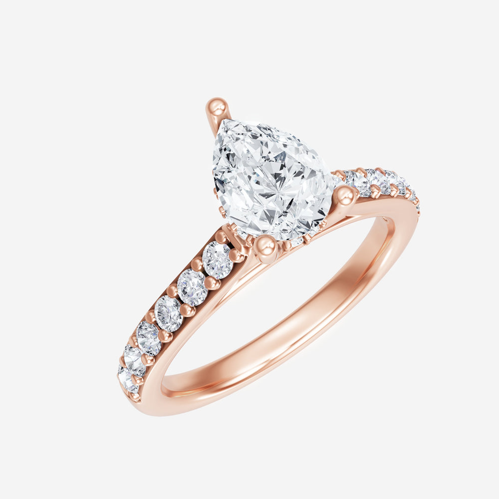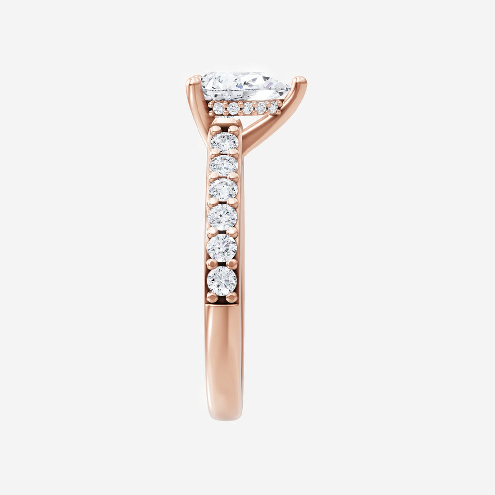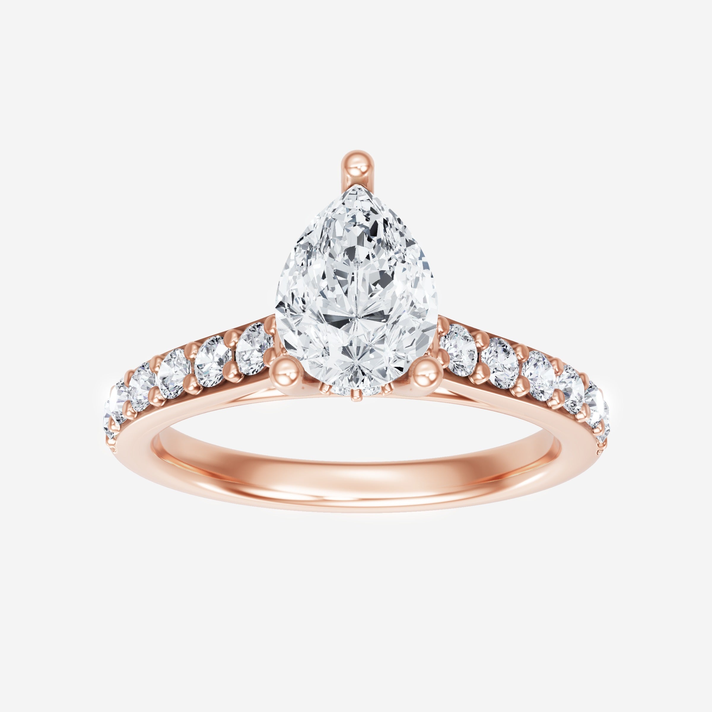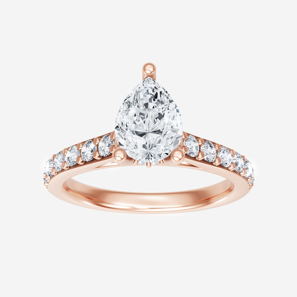 You’ve designed a ring that reflects lasting elegance and grace! Crafted from 14k Rose Gold, this exquisite Pear lab-grown diamond is the centerpiece of this unique design. This Cathedral Diamond Shank with a Hidden Halo head showcases the brilliance of the Pear diamond, creating a timeless look. This elegant piece is the perfect symbol of love, strength, and timeless beauty.