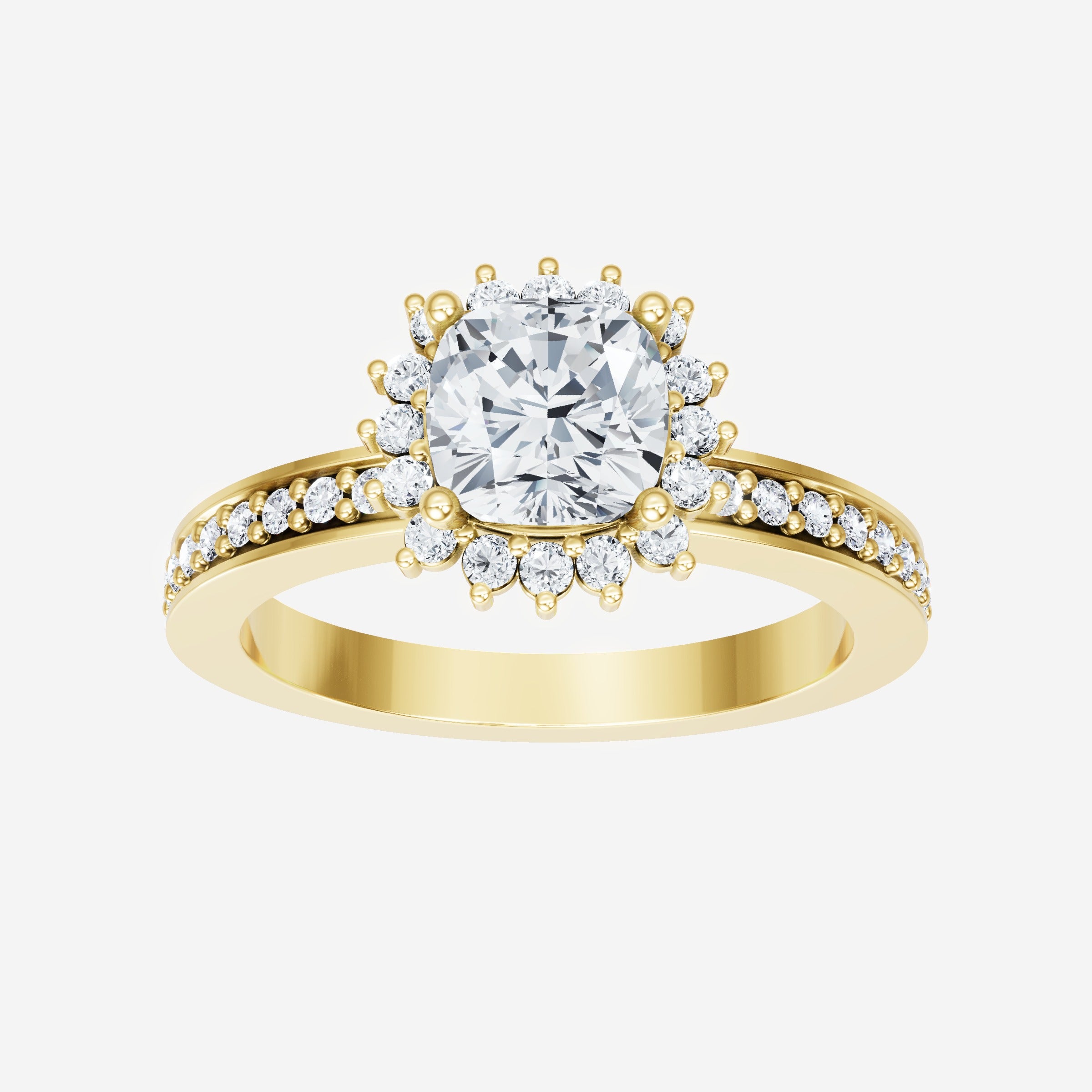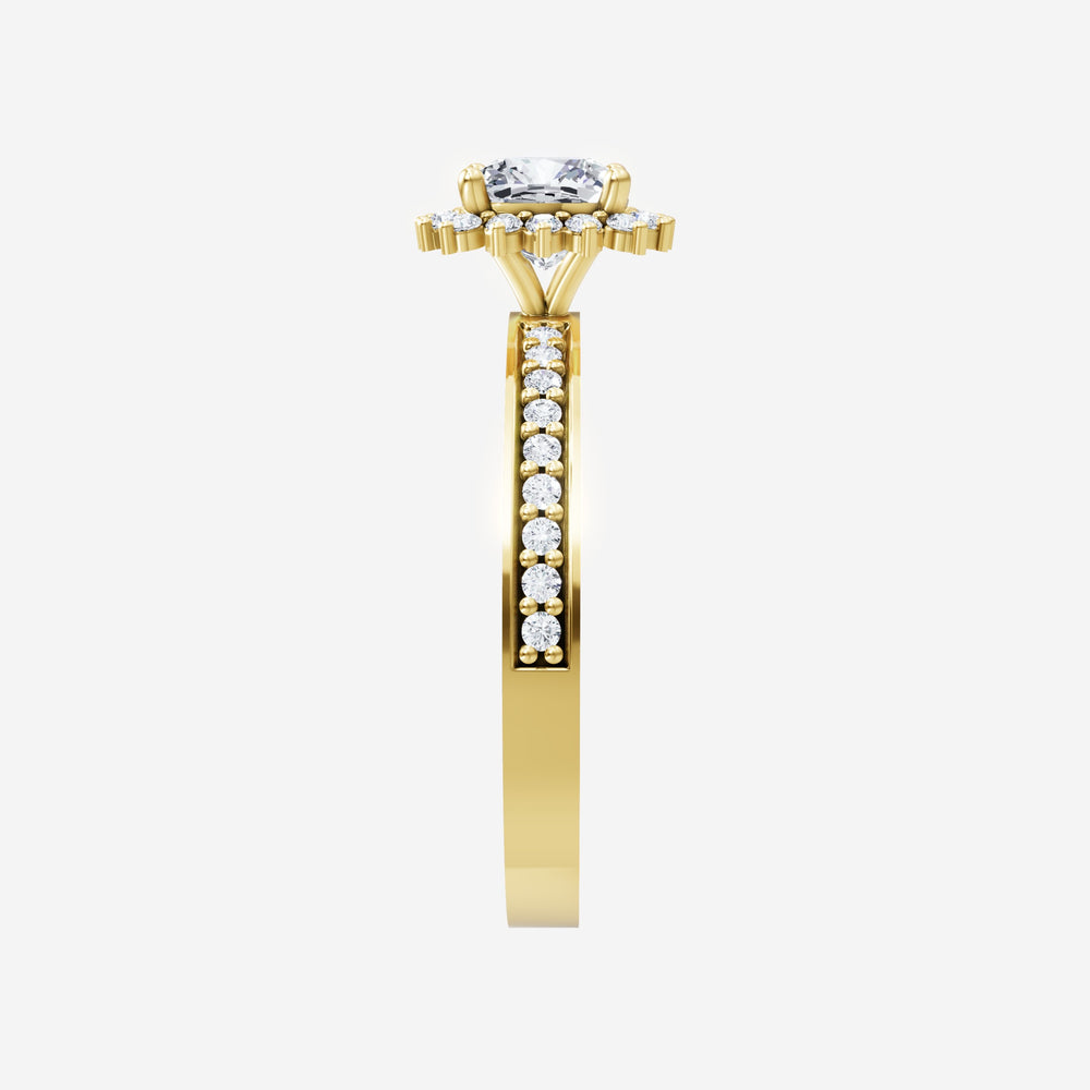 You’ve designed a ring that reflects lasting elegance and grace! Crafted from 14k Yellow Gold, this exquisite Cushion lab-grown diamond is the centerpiece of this unique design. This Single Pave Shank with a Diana Halo head showcases the brilliance of the Cushion diamond, creating a timeless look. This ring will become a cherished reminder of life's most treasured moments.