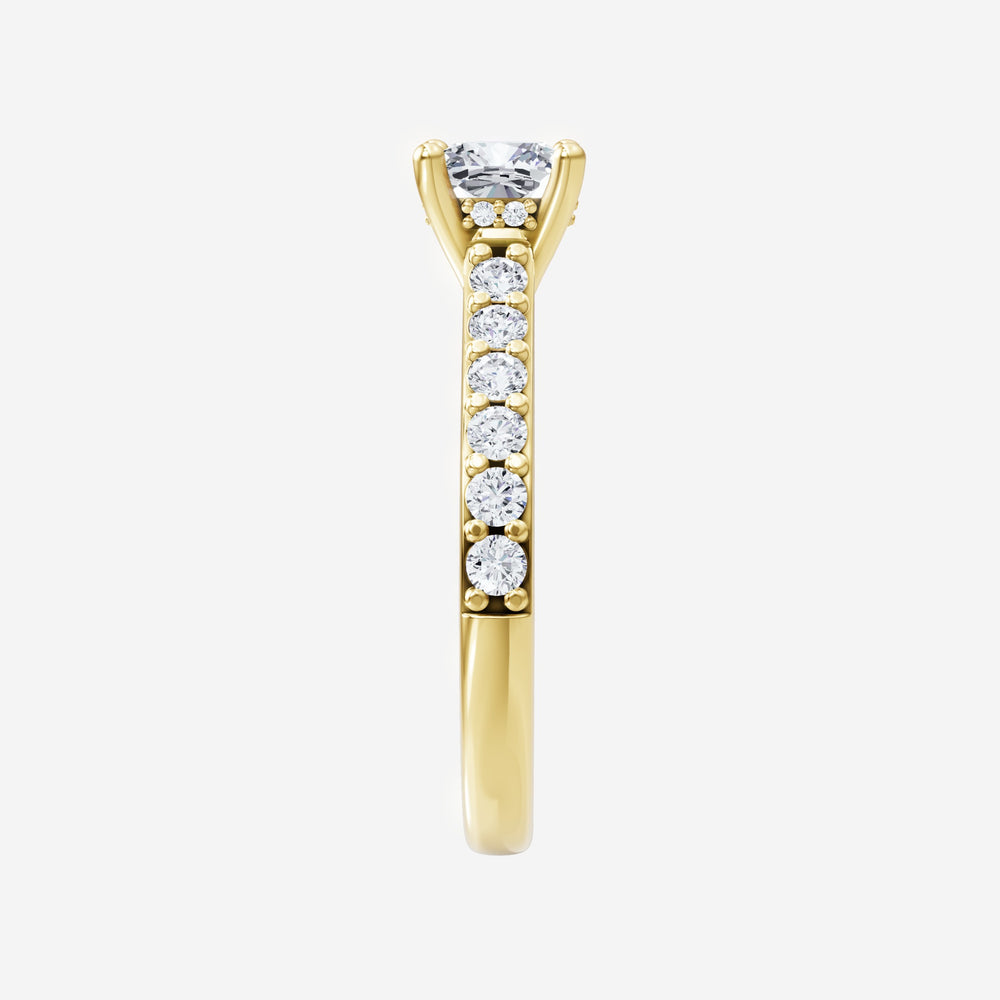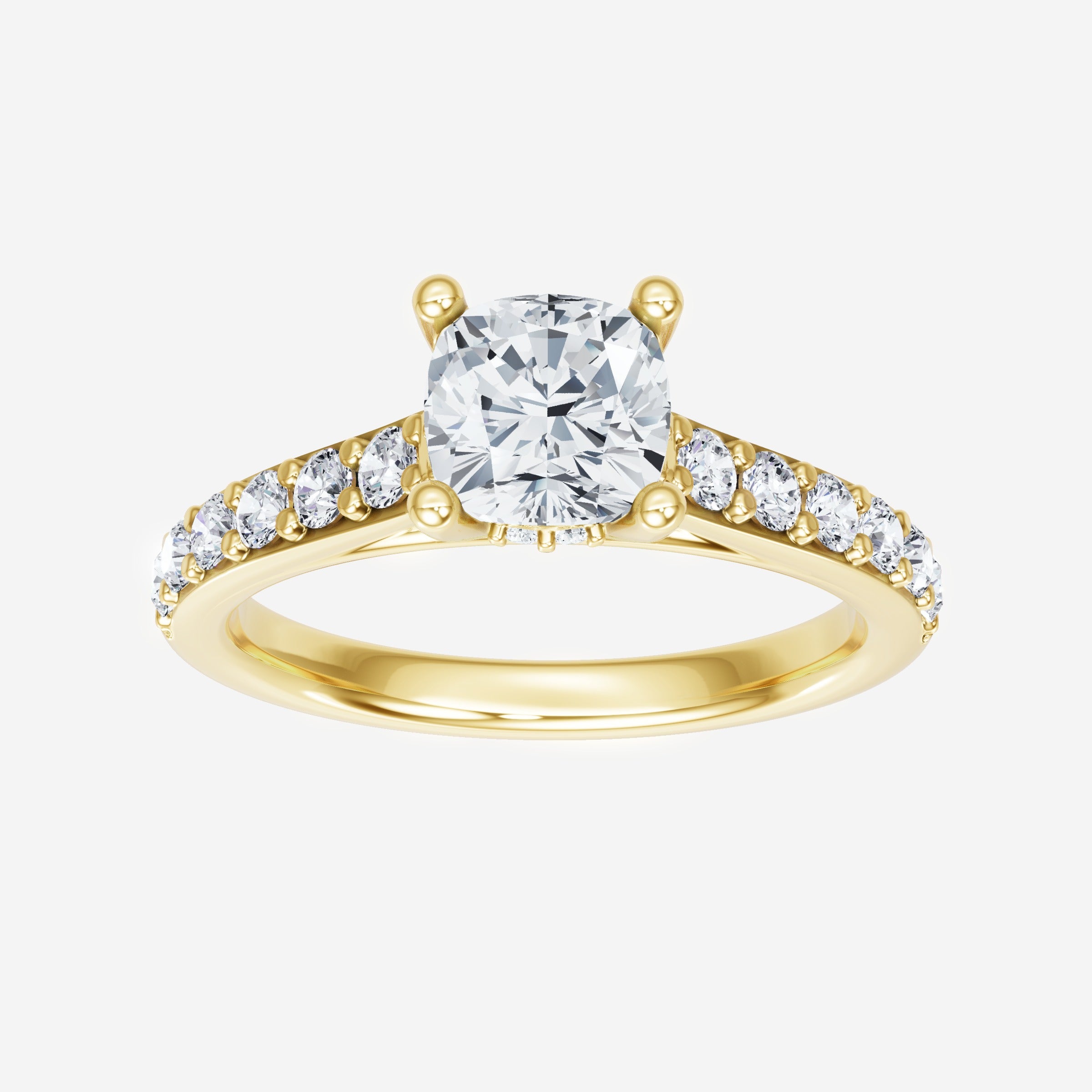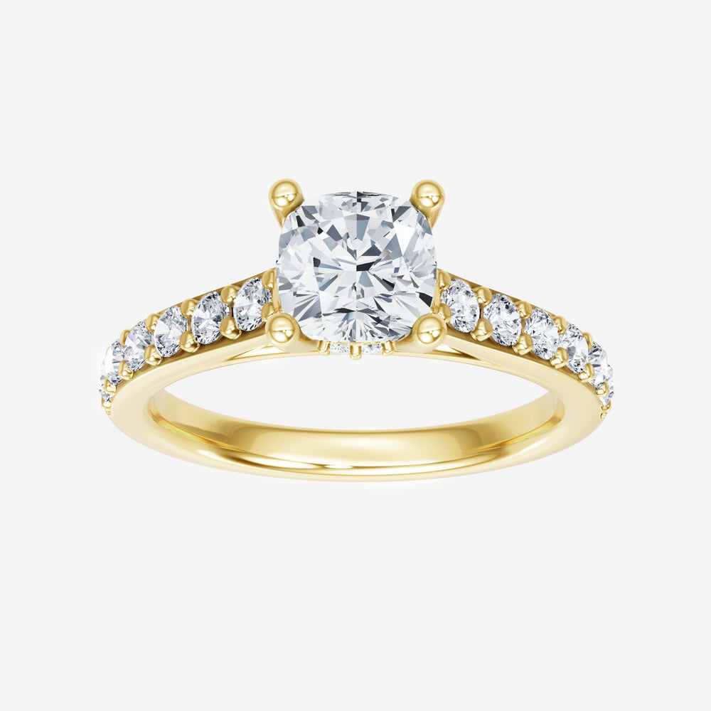 You’ve designed a ring that reflects lasting elegance and grace! Crafted from 14k Yellow Gold, this exquisite Cushion lab-grown diamond is the centerpiece of this unique design. This Cathedral Diamond Shank with a Hidden Halo head showcases the brilliance of the Cushion diamond, creating a timeless look. A perfect choice to celebrate love, commitment, and everything in between.