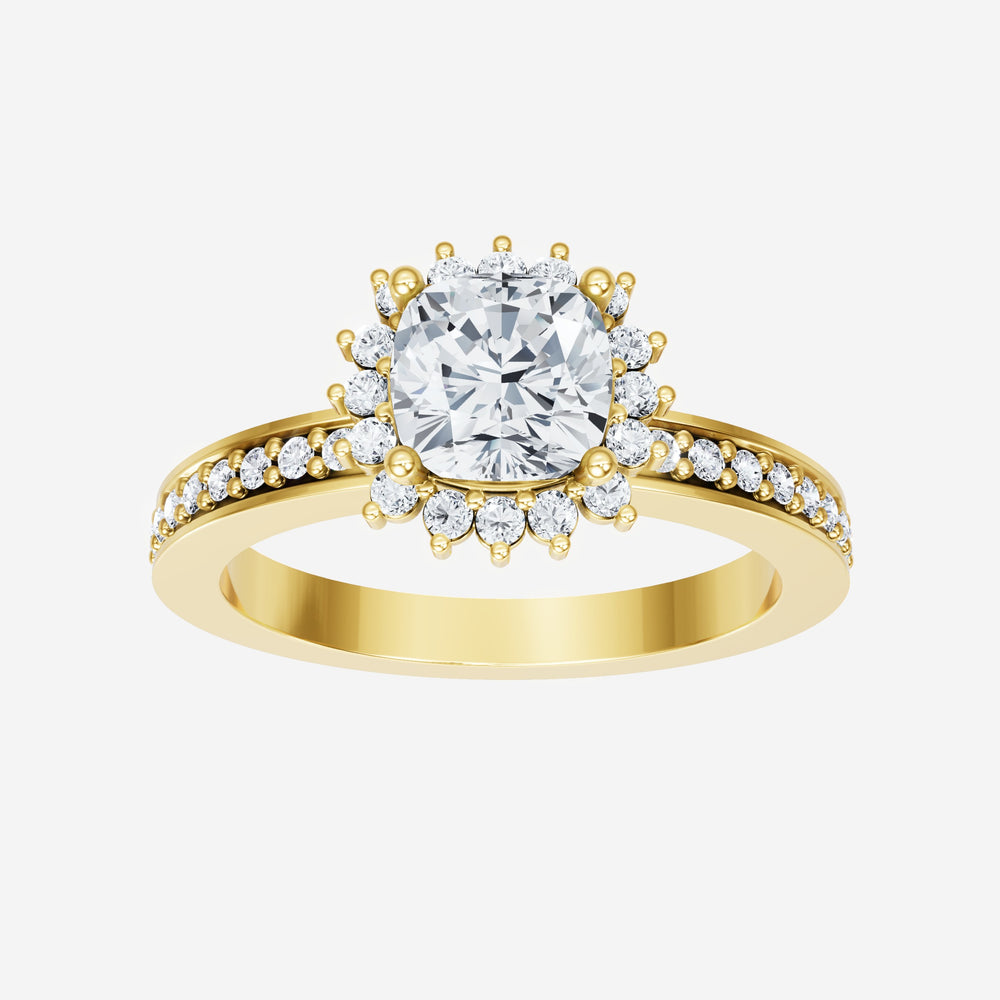 You’ve designed a ring that reflects lasting elegance and grace! Crafted from 18k Yellow Gold, this exquisite Cushion lab-grown diamond is the centerpiece of this unique design. This Single Pave Shank with a Diana Halo head showcases the brilliance of the Cushion diamond, creating a timeless look. A perfect choice to celebrate love, commitment, and everything in between.