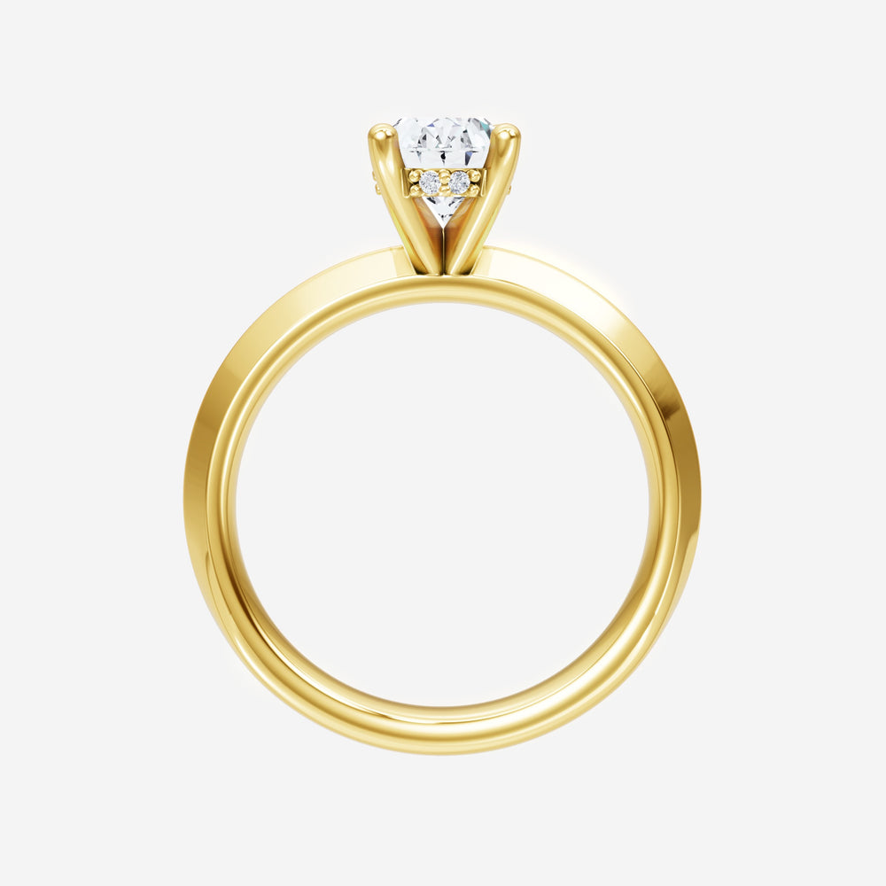 You’ve designed a ring that reflects lasting elegance and grace! Crafted from 18k Yellow Gold, this exquisite Oval lab-grown diamond is the centerpiece of this unique design. This Knife Edge Shank with a Hidden Halo head showcases the brilliance of the Oval diamond, creating a timeless look. This elegant piece is the perfect symbol of love, strength, and timeless beauty.