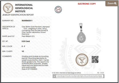 The 5x3mm pear-shaped lab-grown diamond is encircled by a double halo of 36 round side diamonds, creating a mesmerizing pendant that radiates brilliance from every angle. The IGI certification, with certificate number 58J550632311, guarantees the authenticity and quality of this exquisite piece.