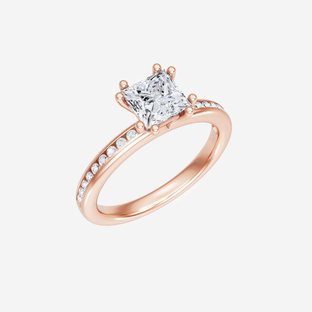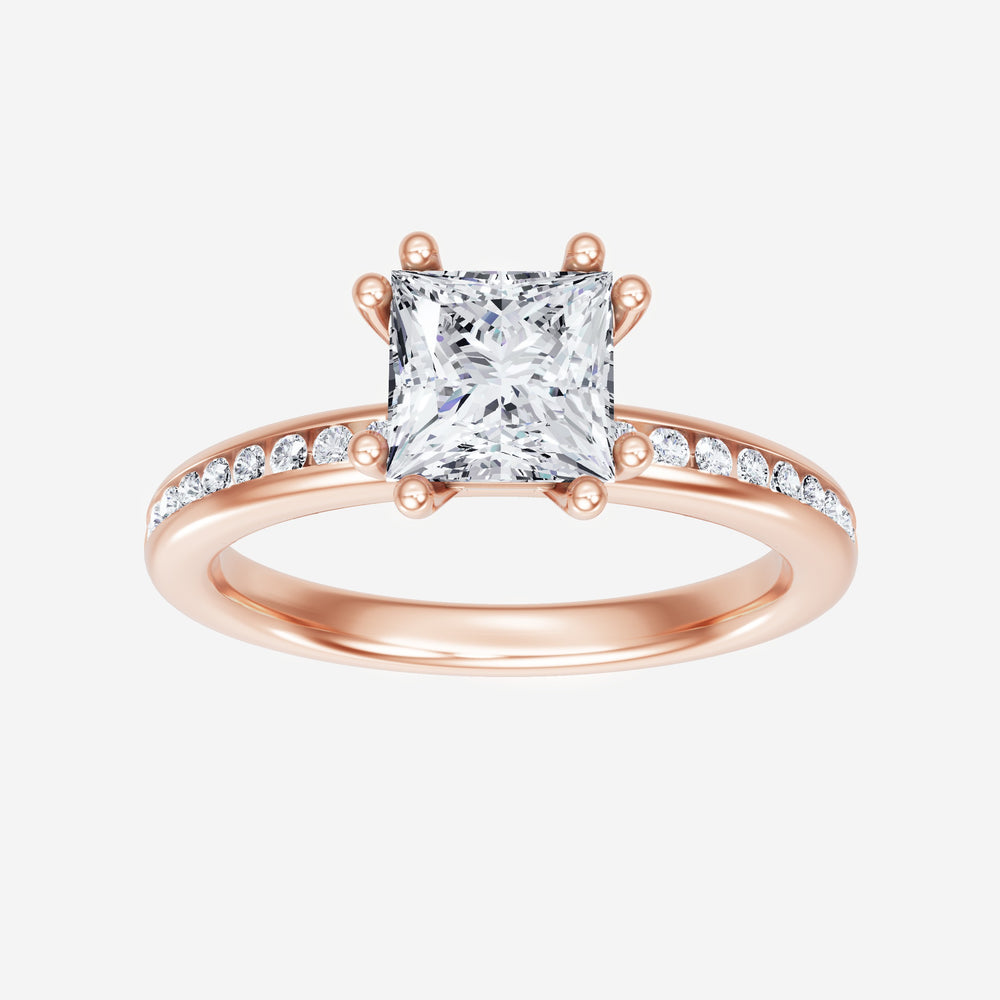 You’ve designed a ring that reflects lasting elegance and grace! Crafted from 18K Rose Gold, this exquisite Princess lab-grown diamond is the centerpiece of this unique design. This Channel Set Shank with a 4 Prong Split Prong head showcases the brilliance of the Princess diamond, creating a timeless look. This ring will become a cherished reminder of life's most treasured moments.