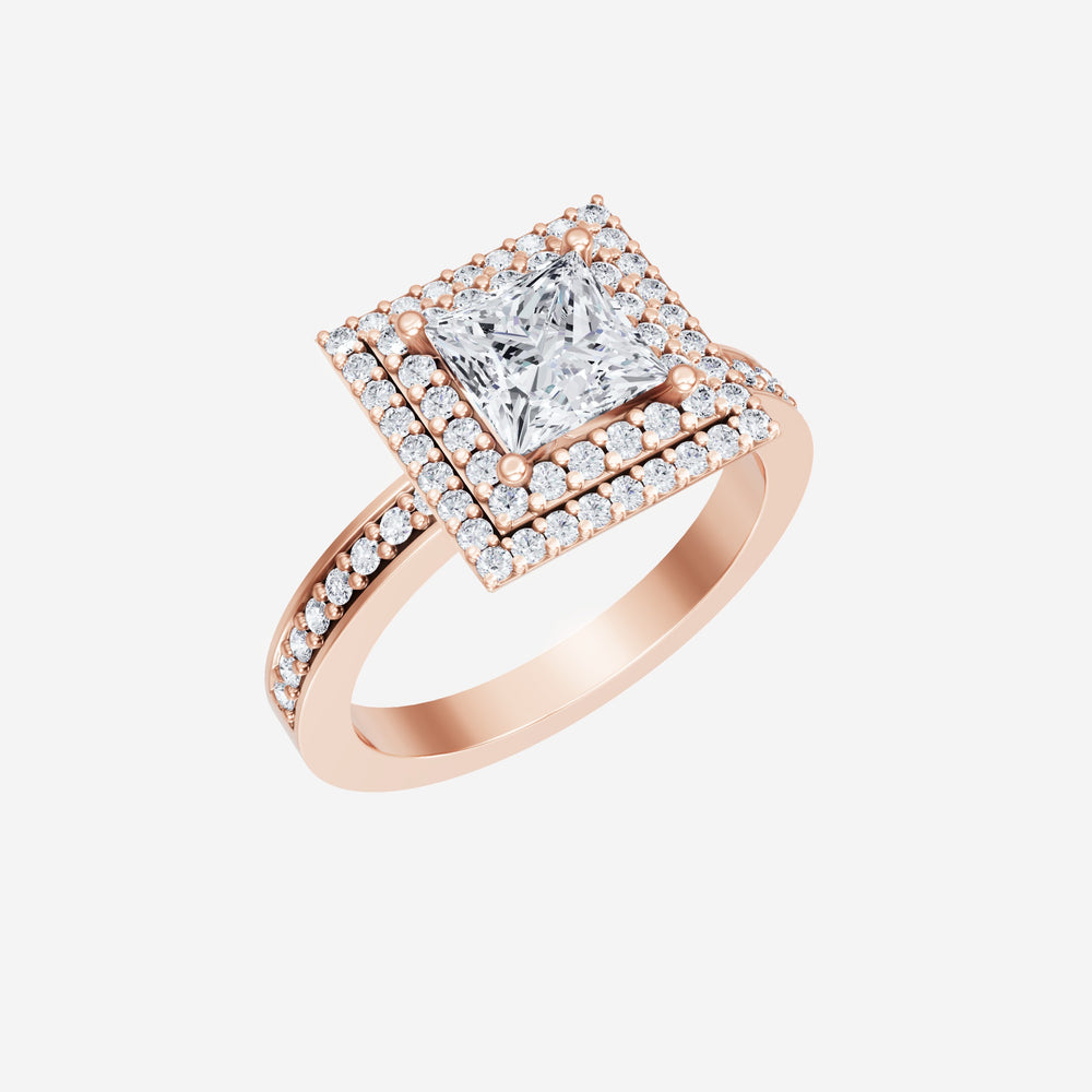 You’ve designed a ring that reflects lasting elegance and grace! Crafted from 18K Rose Gold, this exquisite Princess lab-grown diamond is the centerpiece of this unique design. This Single Pave Shank with a Double Halo head showcases the brilliance of the Princess diamond, creating a timeless look. A perfect choice to celebrate love, commitment, and everything in between.