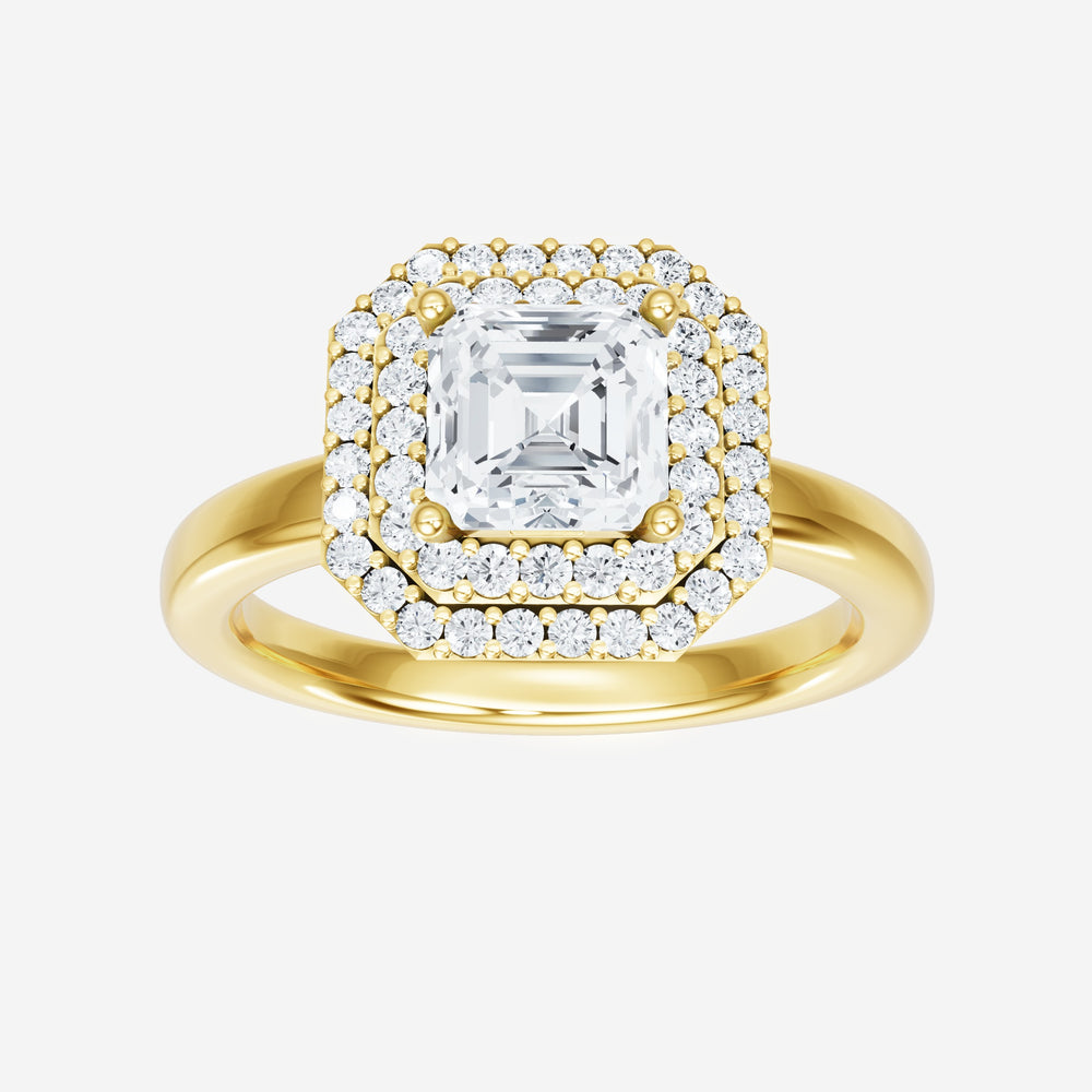 You’ve designed a ring that reflects lasting elegance and grace! Crafted from 18K Yellow Gold, this exquisite Asscher lab-grown diamond is the centerpiece of this unique design. This Basic Plain Shank with a Double Halo head showcases the brilliance of the Asscher diamond, creating a timeless look. This stunning ring makes the perfect symbol of everlasting love and devotion.