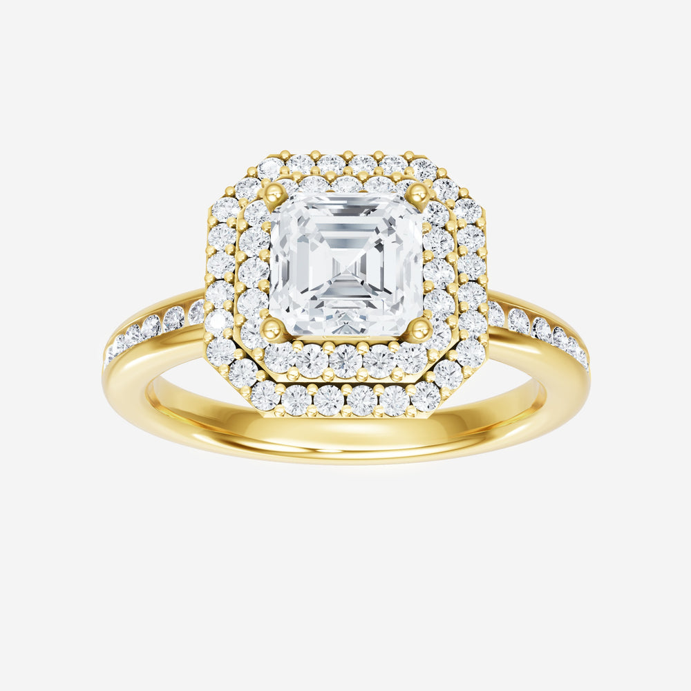 You’ve designed a ring that reflects lasting elegance and grace! Crafted from 18K Yellow Gold, this exquisite Asscher lab-grown diamond is the centerpiece of this unique design. This Channel Set Shank with a Double Halo head showcases the brilliance of the Asscher diamond, creating a timeless look. It's a piece of elegance and beauty, perfect for marking life's most beautiful occasions.
