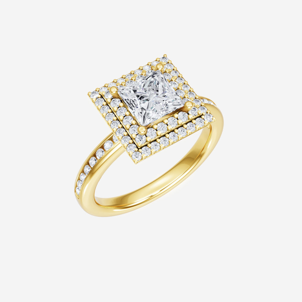 You’ve designed a ring that reflects lasting elegance and grace! Crafted from 18K Yellow Gold, this exquisite Princess lab-grown diamond is the centerpiece of this unique design. This Channel Set Shank with a Double Halo head showcases the brilliance of the Princess diamond, creating a timeless look. Whether as a gift or a personal treasure, this ring will forever symbolize the most meaningful moments in life.