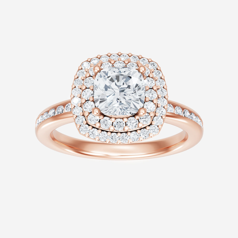 You’ve designed a ring that reflects lasting elegance and grace! Crafted from 14k Rose Gold, this exquisite Cushion lab-grown diamond is the centerpiece of this unique design. This Channel Set Shank with a Double Halo head showcases the brilliance of the Cushion diamond, creating a timeless look. This ring will become a cherished reminder of life's most treasured moments.