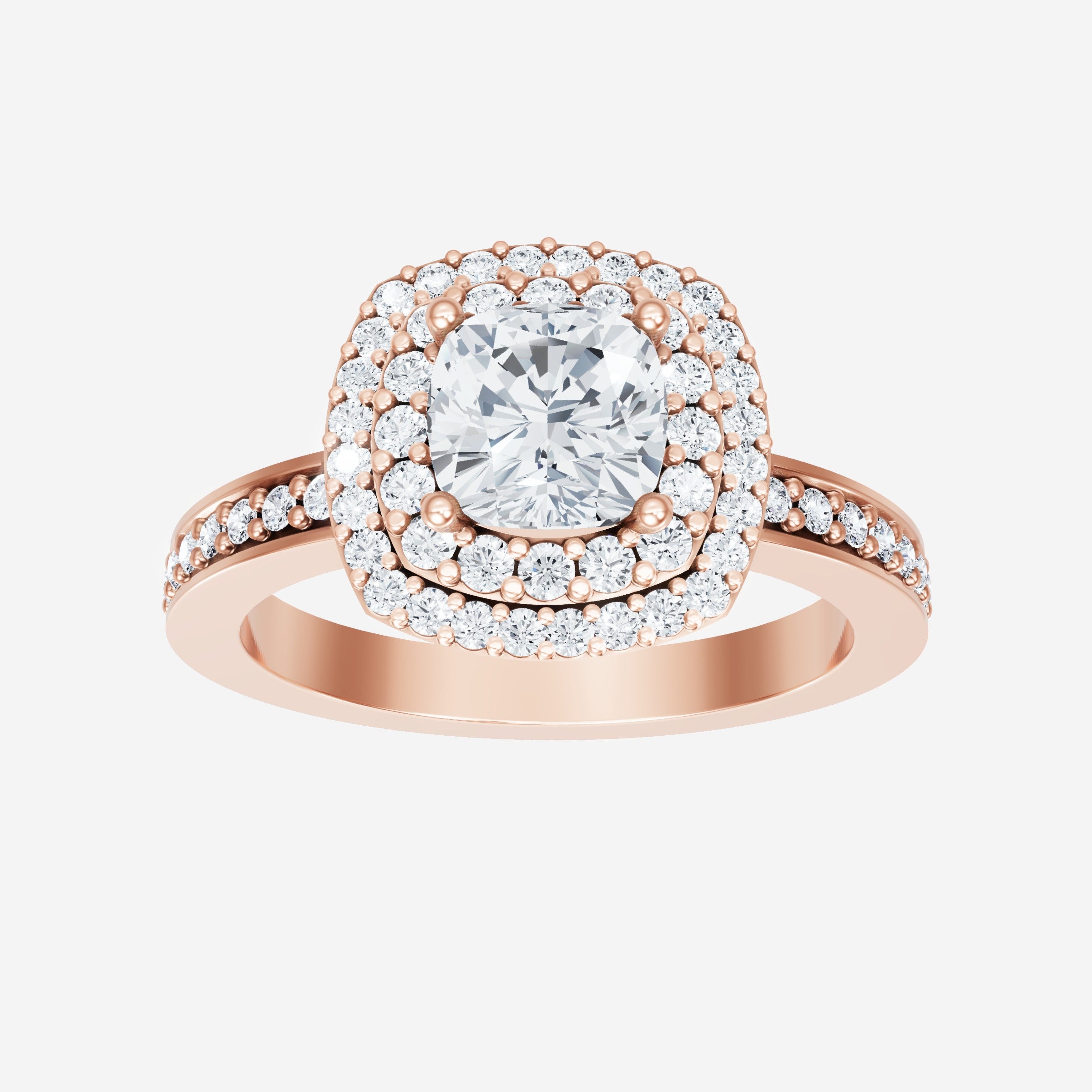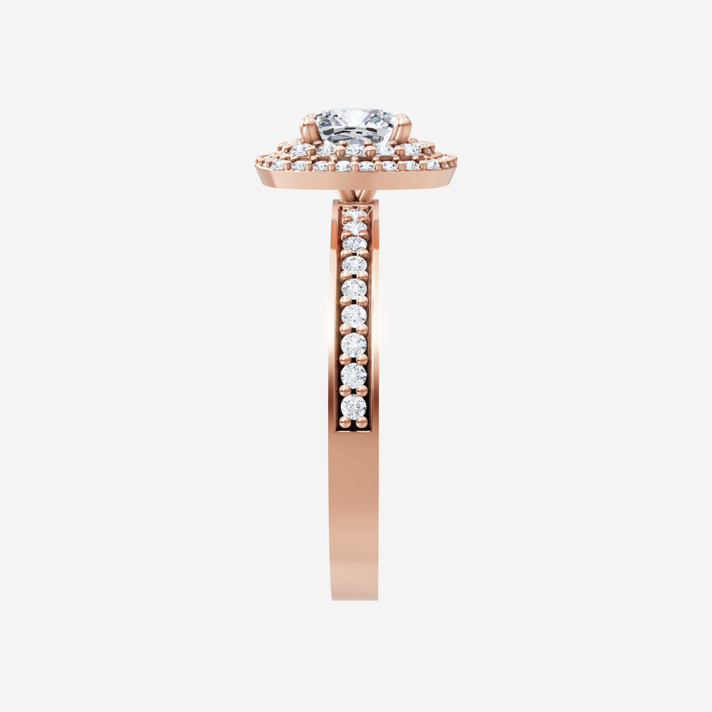 You’ve designed a ring that reflects lasting elegance and grace! Crafted from 14k Rose Gold, this exquisite Cushion lab-grown diamond is the centerpiece of this unique design. This Single Pave Shank with a Double Halo head showcases the brilliance of the Cushion diamond, creating a timeless look. Ideal for those who seek both beauty and meaning, this ring will stand as a testament to cherished memories.