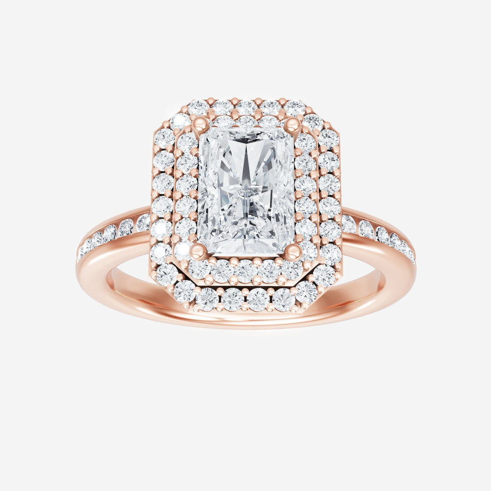 You’ve designed a ring that reflects lasting elegance and grace! Crafted from 14k Rose Gold, this exquisite Radiant lab-grown diamond is the centerpiece of this unique design. This Channel Set Shank with a Double Halo head showcases the brilliance of the Radiant diamond, creating a timeless look. Ideal for those who seek both beauty and meaning, this ring will stand as a testament to cherished memories.