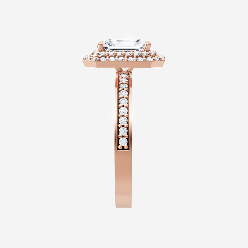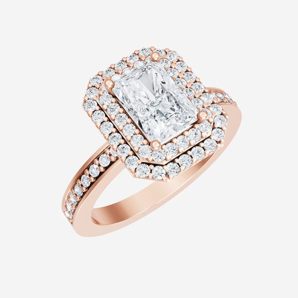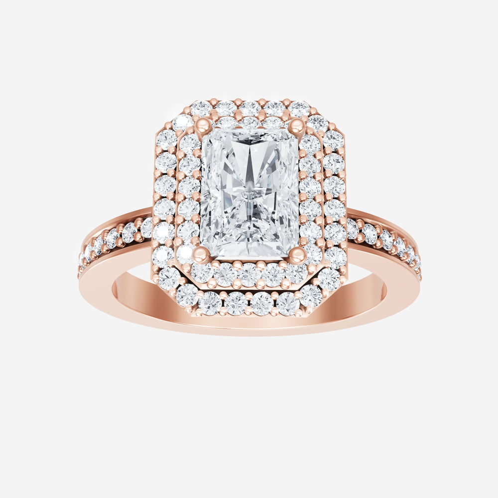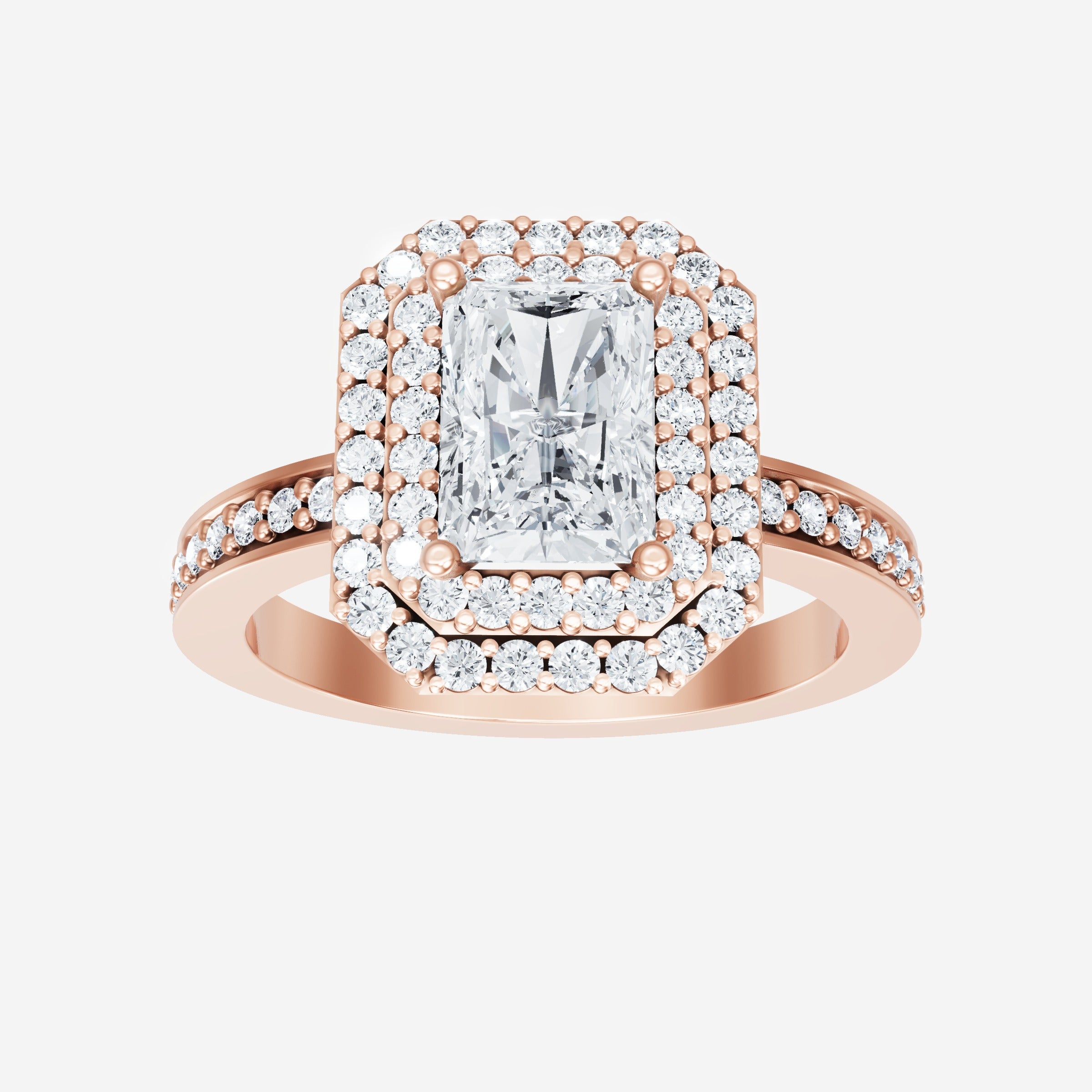 You’ve designed a ring that reflects lasting elegance and grace! Crafted from 14k Rose Gold, this exquisite Radiant lab-grown diamond is the centerpiece of this unique design. This Single Pave Shank with a Double Halo head showcases the brilliance of the Radiant diamond, creating a timeless look. A perfect choice to celebrate love, commitment, and everything in between.