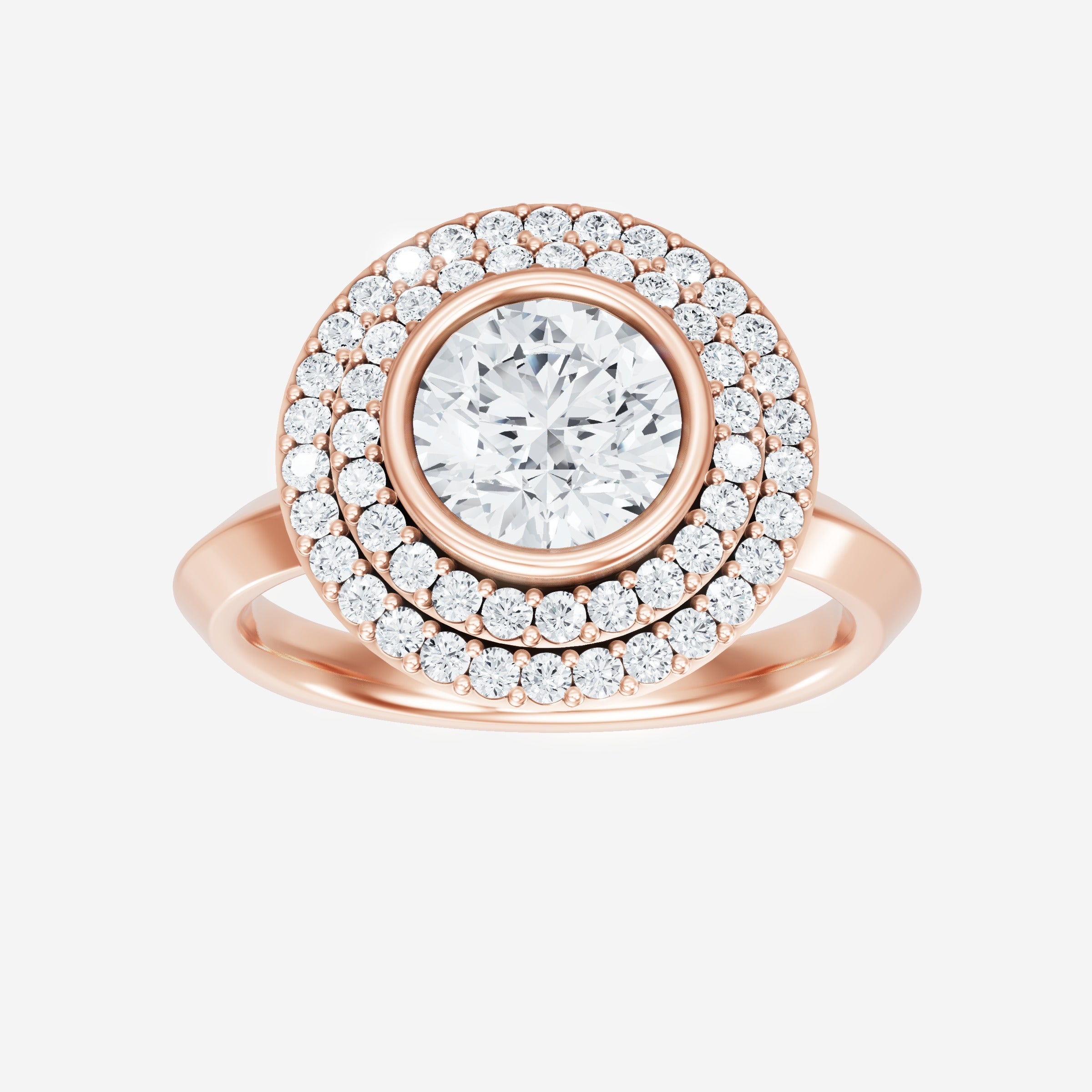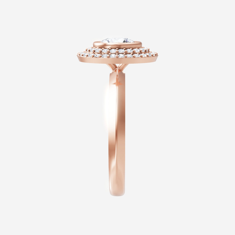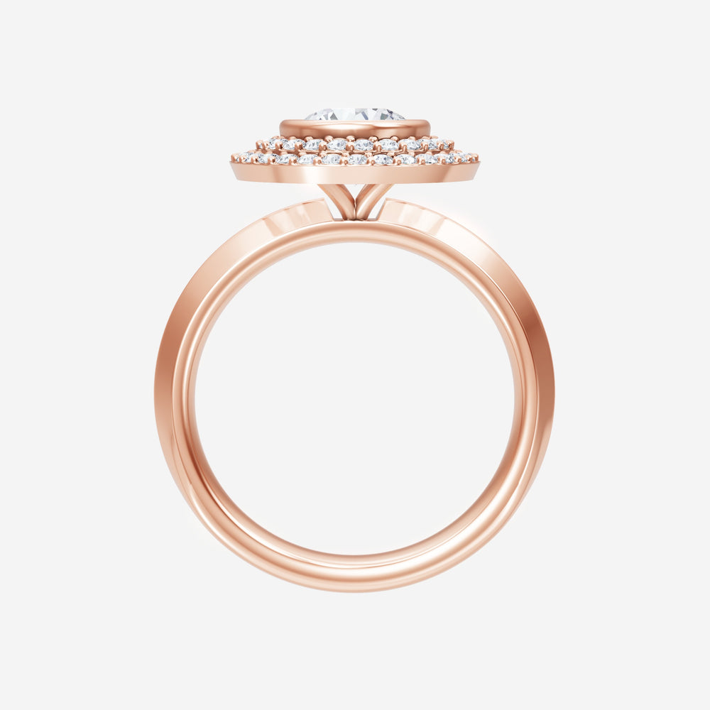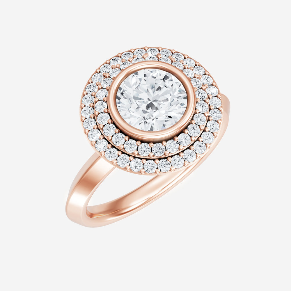 You’ve designed a ring that reflects lasting elegance and grace! Crafted from 14k Rose Gold, this exquisite Round lab-grown diamond is the centerpiece of this unique design. This Knife Edge Shank with a Bezel Set Center With Double Halo head showcases the brilliance of the Round diamond, creating a timeless look. This ring will become a cherished reminder of life's most treasured moments.