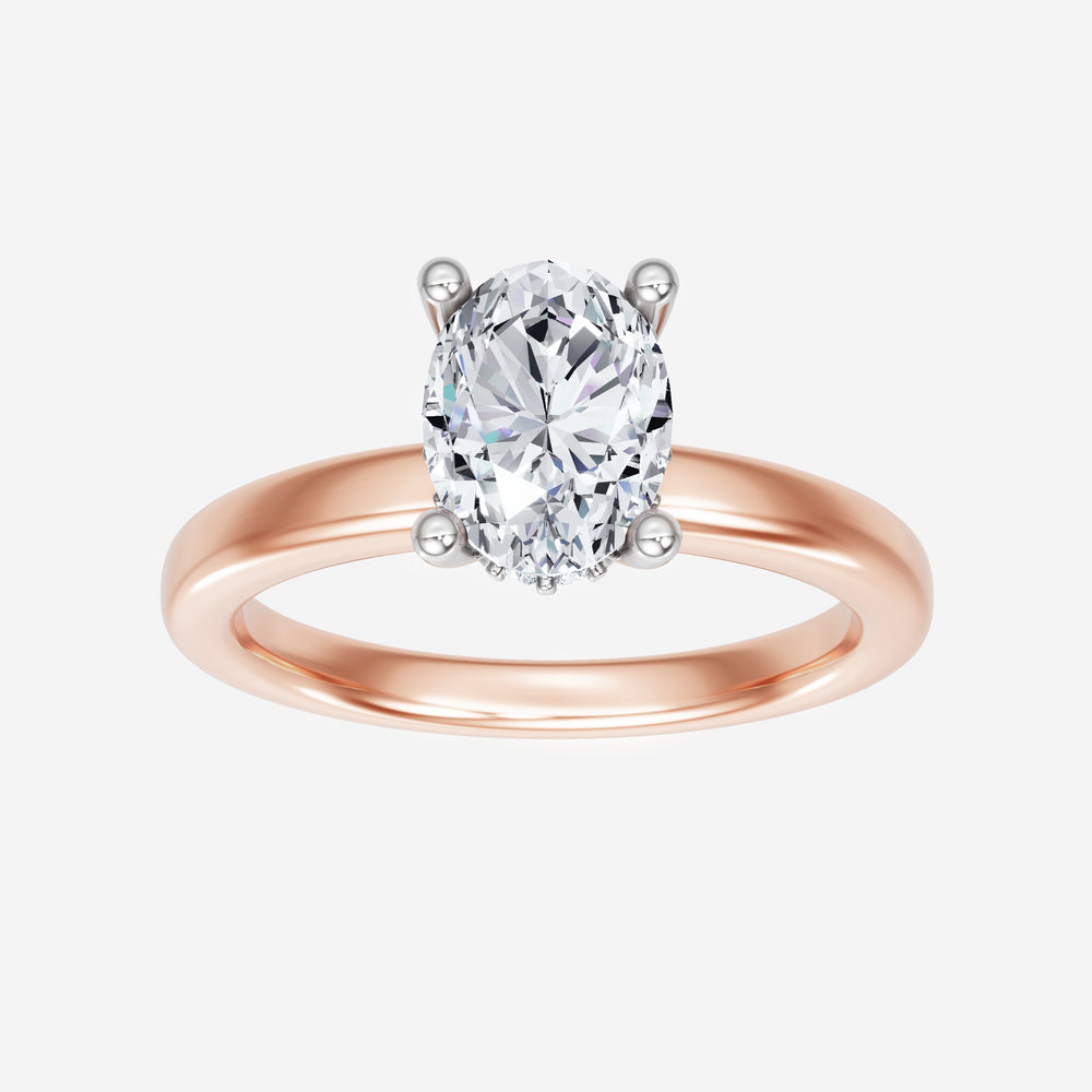 You’ve designed a ring that reflects lasting elegance and grace! Crafted from 14k Rose White Dual Tone, this exquisite Oval lab-grown diamond is the centerpiece of this unique design. This Basic Plain Shank with a Hidden Halo head showcases the brilliance of the Oval diamond, creating a timeless look. A perfect choice to celebrate love, commitment, and everything in between.