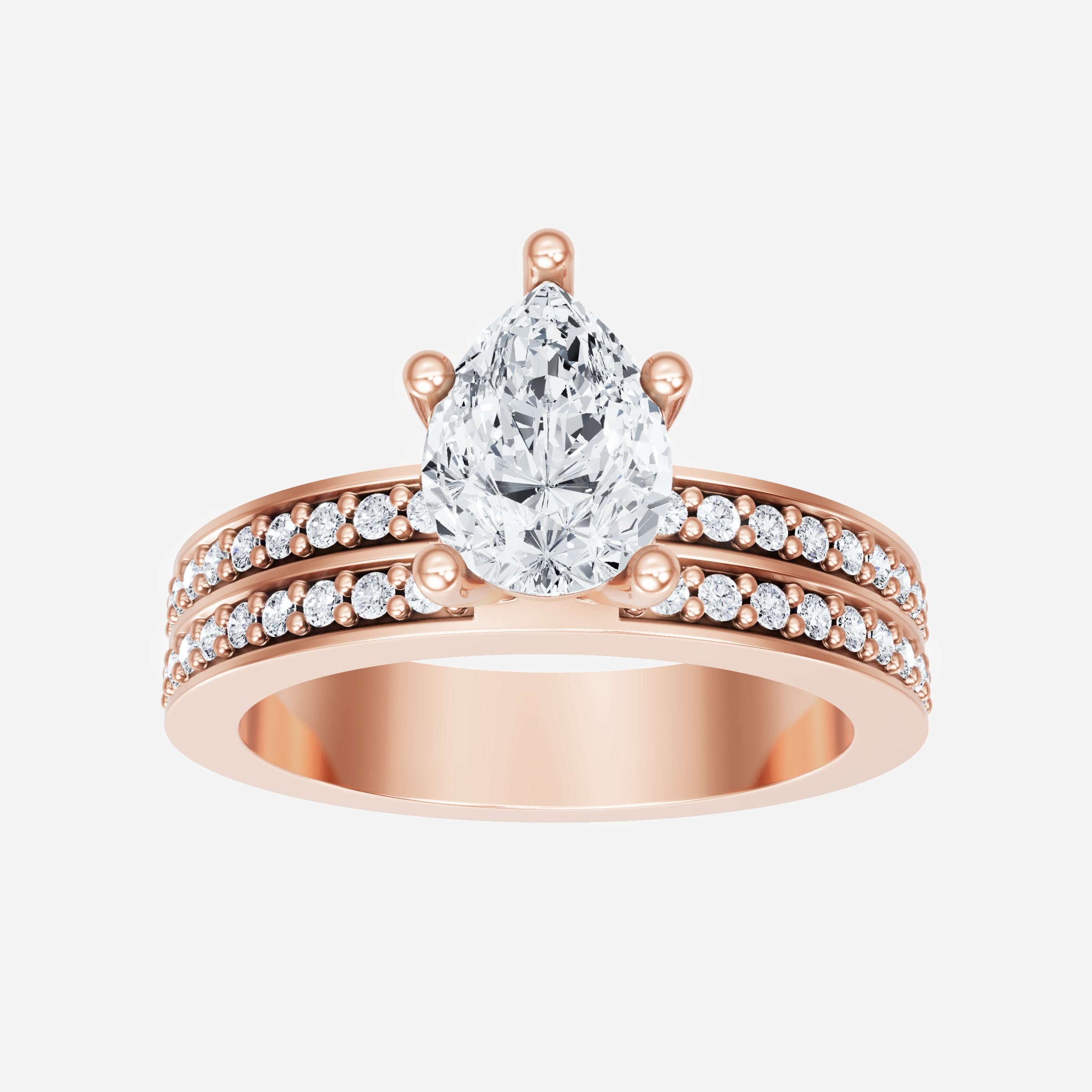 You’ve designed a ring that reflects lasting elegance and grace! Crafted from 18K Rose Gold, this exquisite Pear lab-grown diamond is the centerpiece of this unique design. This Double Row Pave with a 5 Prong Head head showcases the brilliance of the Pear diamond, creating a timeless look. Whether as a gift or a personal treasure, this ring will forever symbolize the most meaningful moments in life.
