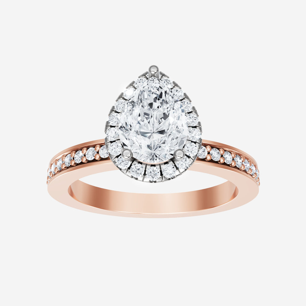 You’ve designed a ring that reflects lasting elegance and grace! Crafted from 18k Rose White Dual Tone, this exquisite Pear lab-grown diamond is the centerpiece of this unique design. This Single Pave Shank with a Micro Halo head showcases the brilliance of the Pear diamond, creating a timeless look. It's a piece of elegance and beauty, perfect for marking life's most beautiful occasions.