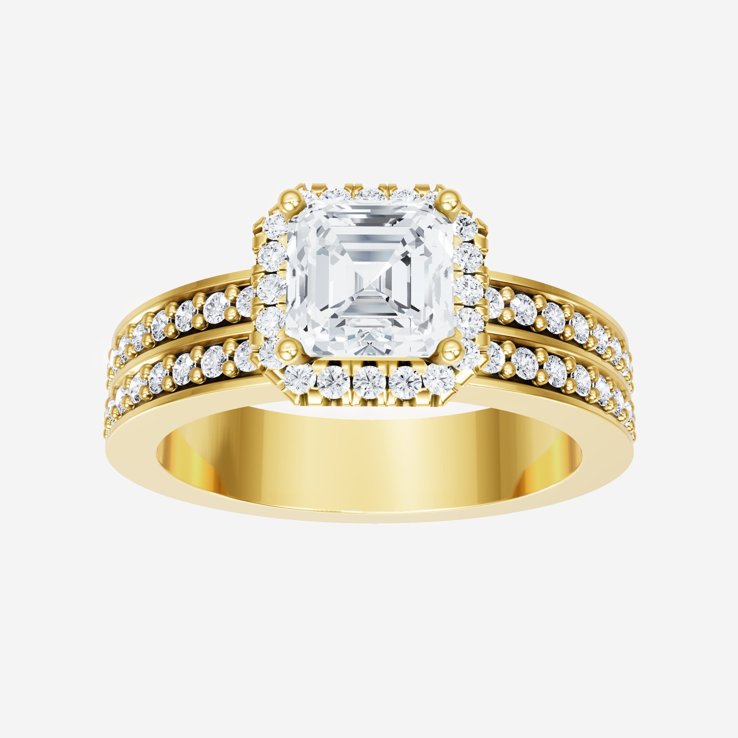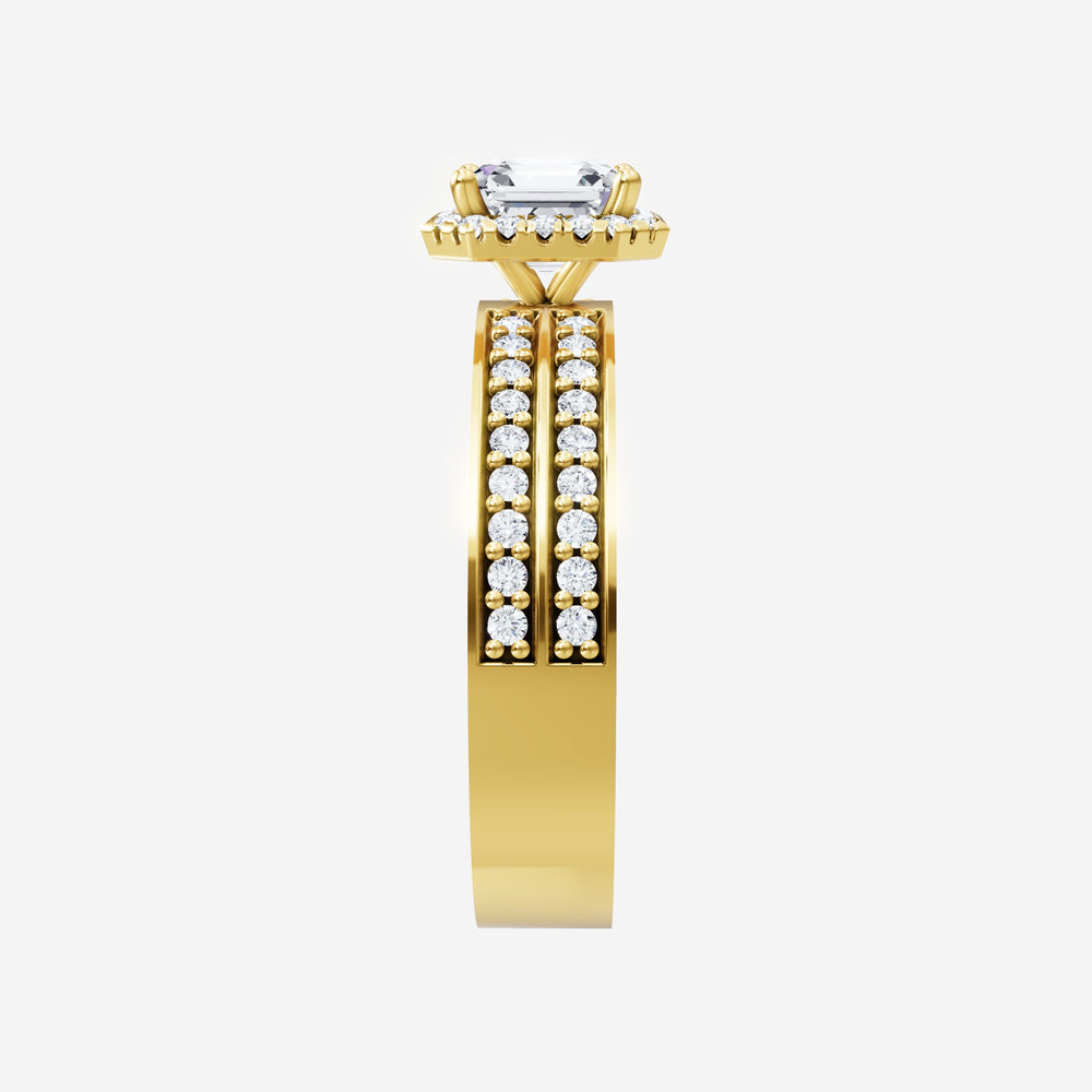 You’ve designed a ring that reflects lasting elegance and grace! Crafted from 18K Yellow Gold, this exquisite Asscher lab-grown diamond is the centerpiece of this unique design. This Double Row Pave with a Micro Halo head showcases the brilliance of the Asscher diamond, creating a timeless look. A perfect choice to celebrate love, commitment, and everything in between.
