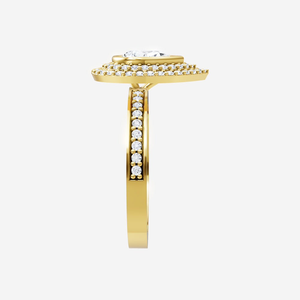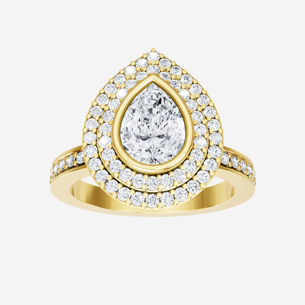 You’ve designed a ring that reflects lasting elegance and grace! Crafted from 18K Yellow Gold, this exquisite Pear lab-grown diamond is the centerpiece of this unique design. This Single Pave Shank with a Bezel Set Center With Double Halo head showcases the brilliance of the Pear diamond, creating a timeless look. Whether as a gift or a personal treasure, this ring will forever symbolize the most meaningful moments in life.