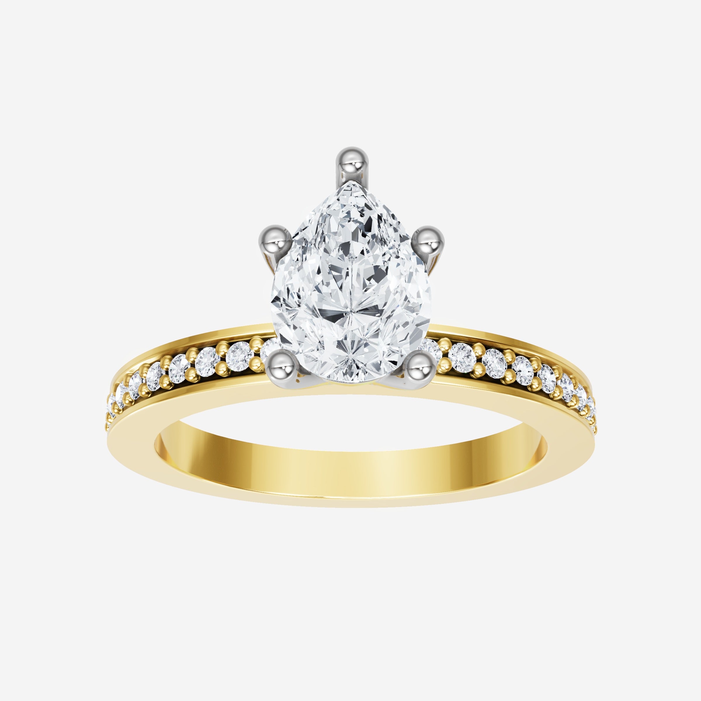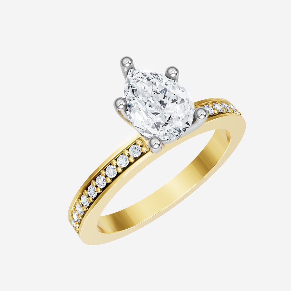 You’ve designed a ring that reflects lasting elegance and grace! Crafted from 18k Yellow White Dual Tone, this exquisite Pear lab-grown diamond is the centerpiece of this unique design. This Single Pave Shank with a 5 Prong Head head showcases the brilliance of the Pear diamond, creating a timeless look. It's a piece of elegance and beauty, perfect for marking life's most beautiful occasions.
