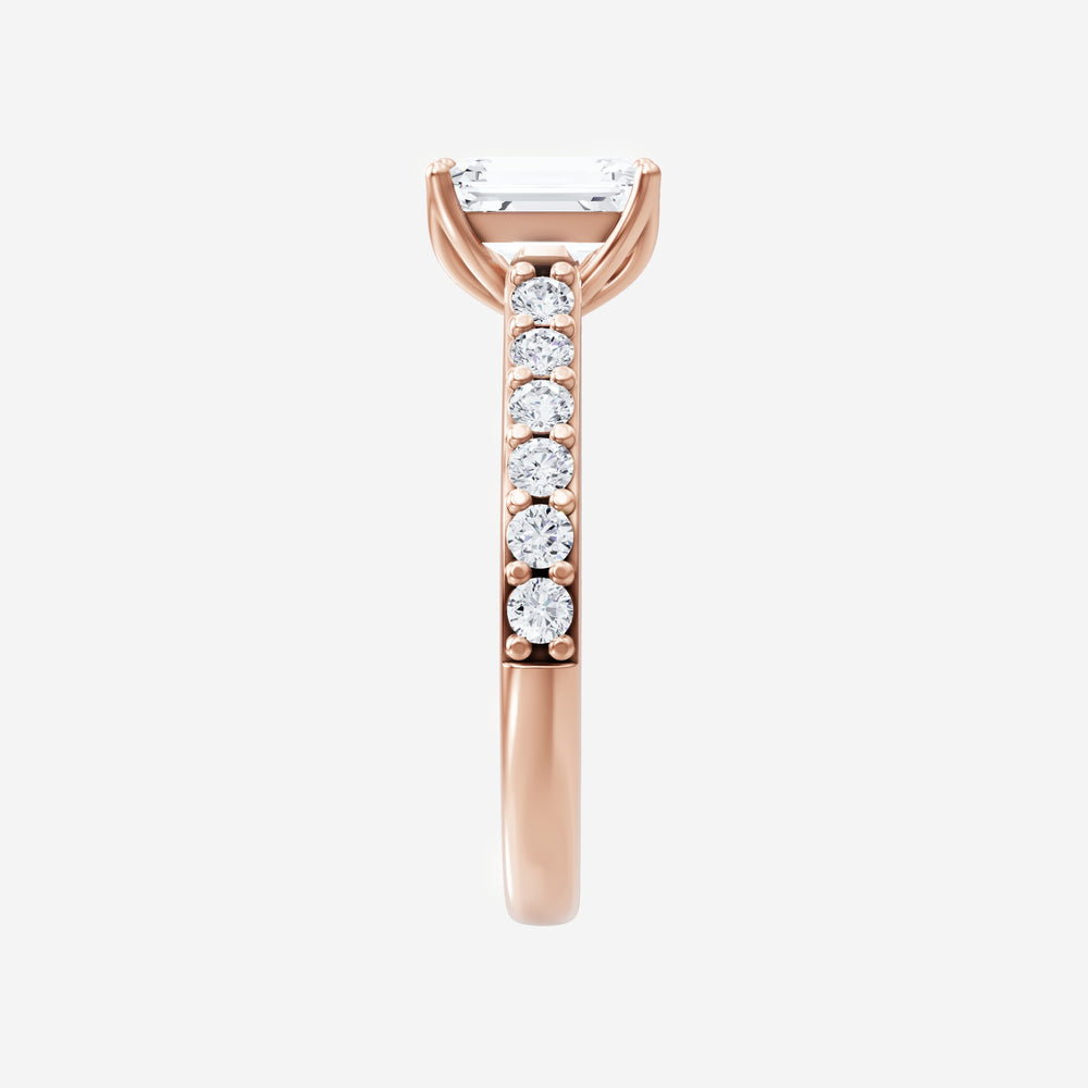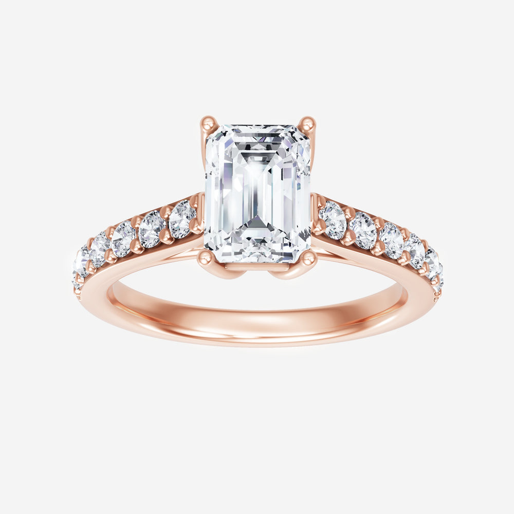 You’ve designed a ring that reflects lasting elegance and grace! Crafted from 14k Rose Gold, this exquisite Emerald lab-grown diamond is the centerpiece of this unique design. This Cathedral Diamond Shank with a 4 Prong Flower Head head showcases the brilliance of the Emerald diamond, creating a timeless look. This stunning ring makes the perfect symbol of everlasting love and devotion.