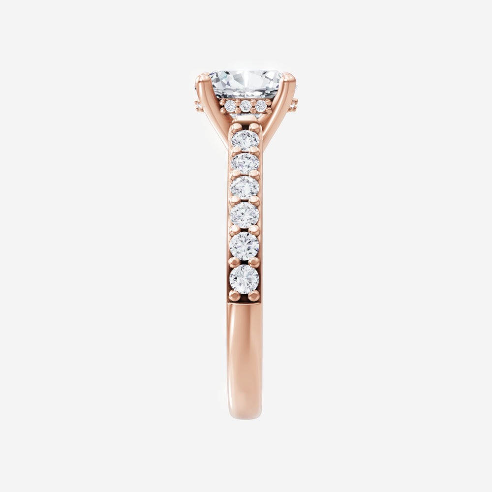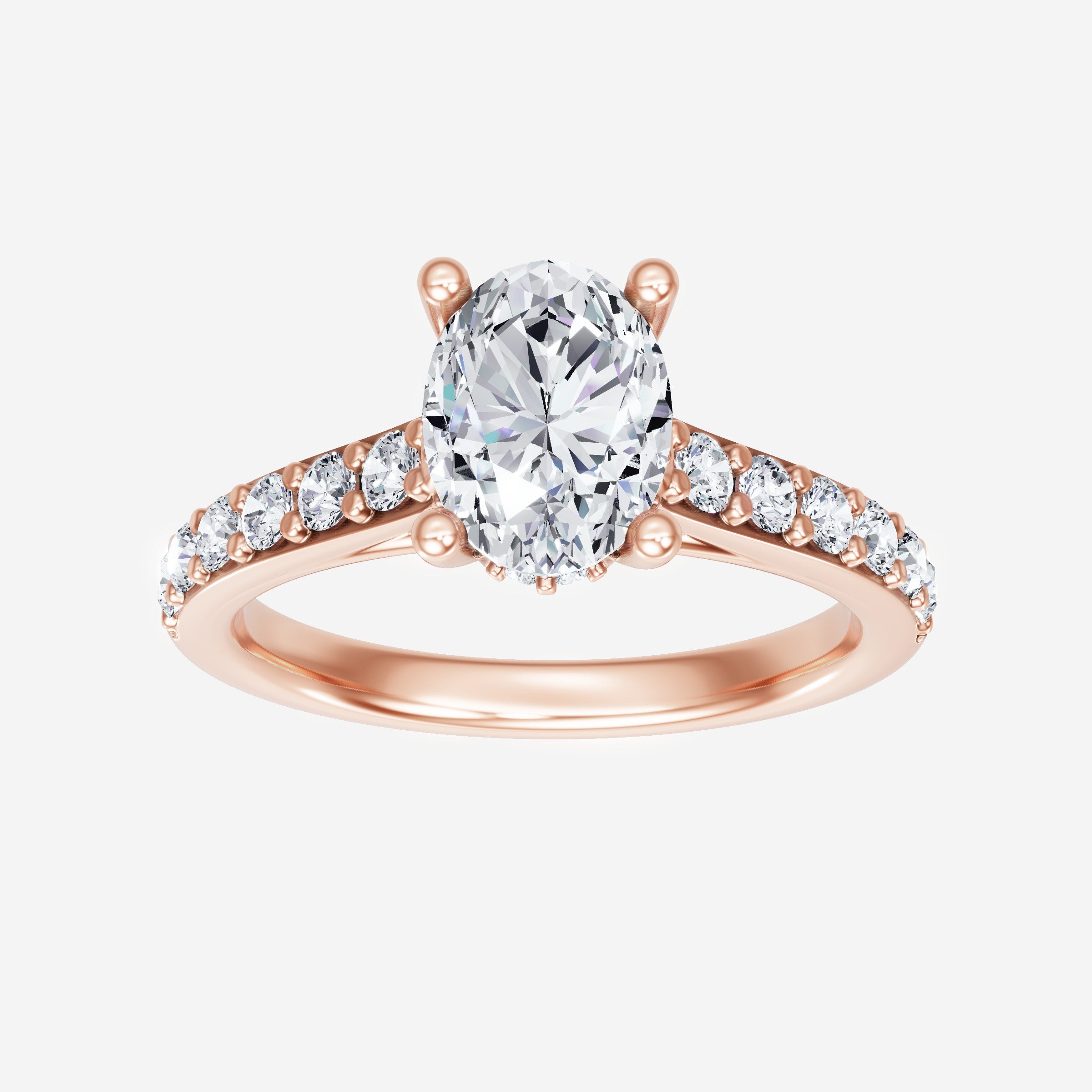 You’ve designed a ring that reflects lasting elegance and grace! Crafted from 14k Rose Gold, this exquisite Oval lab-grown diamond is the centerpiece of this unique design. This Cathedral Diamond Shank with a Hidden Halo head showcases the brilliance of the Oval diamond, creating a timeless look. This ring will become a cherished reminder of life's most treasured moments.