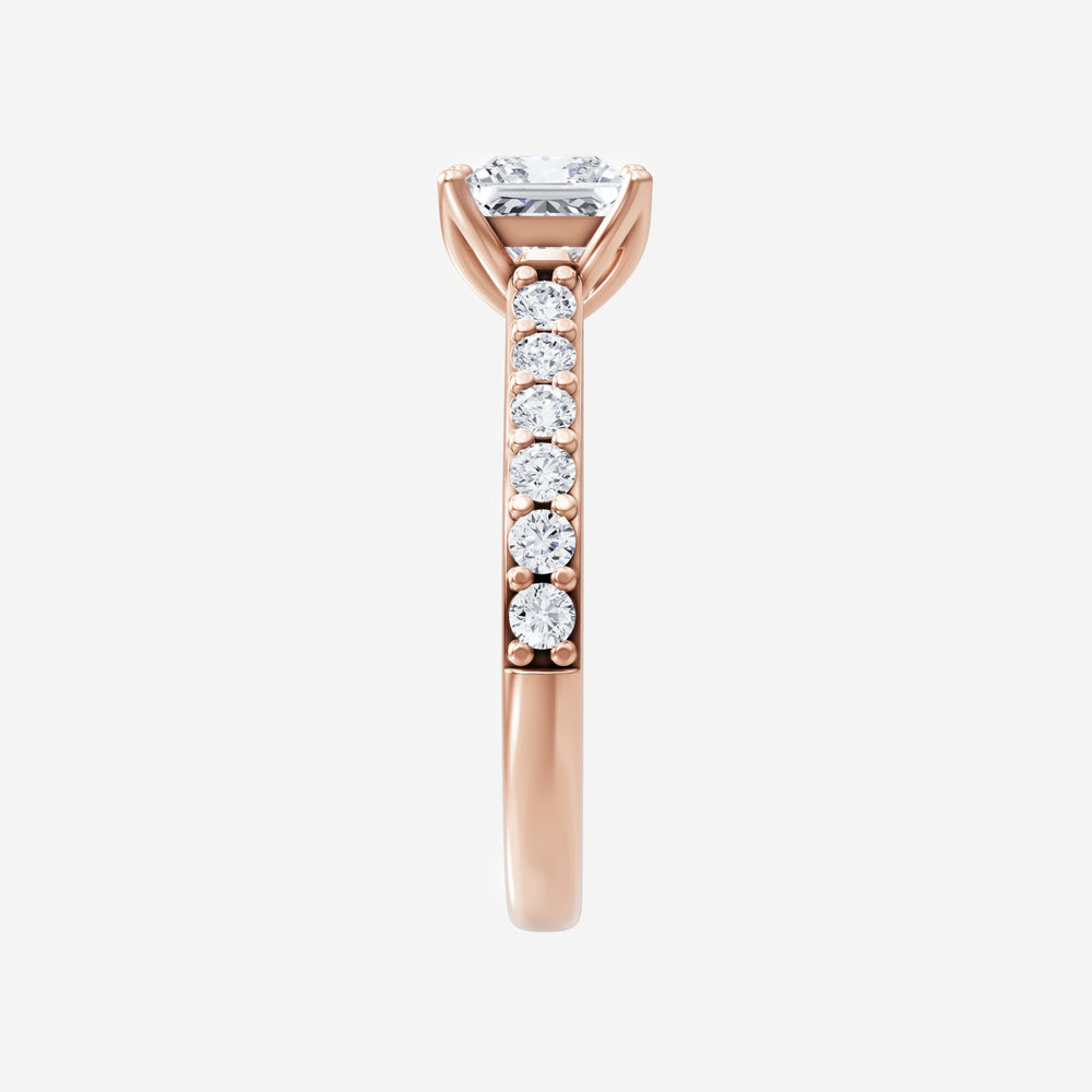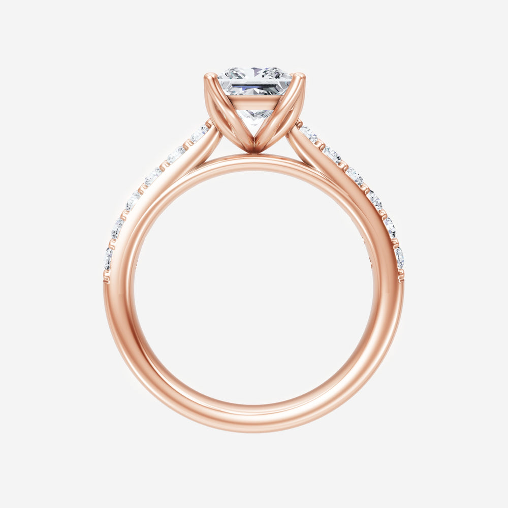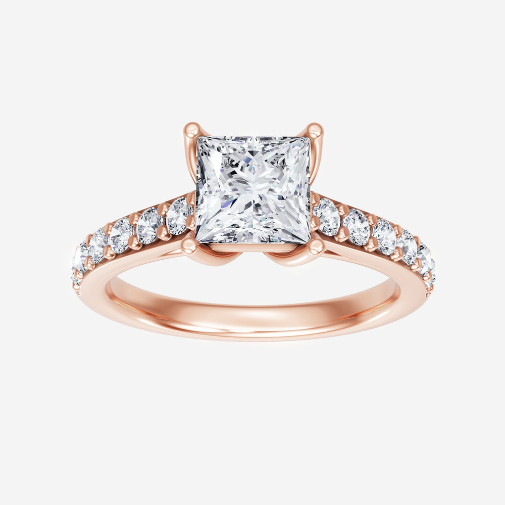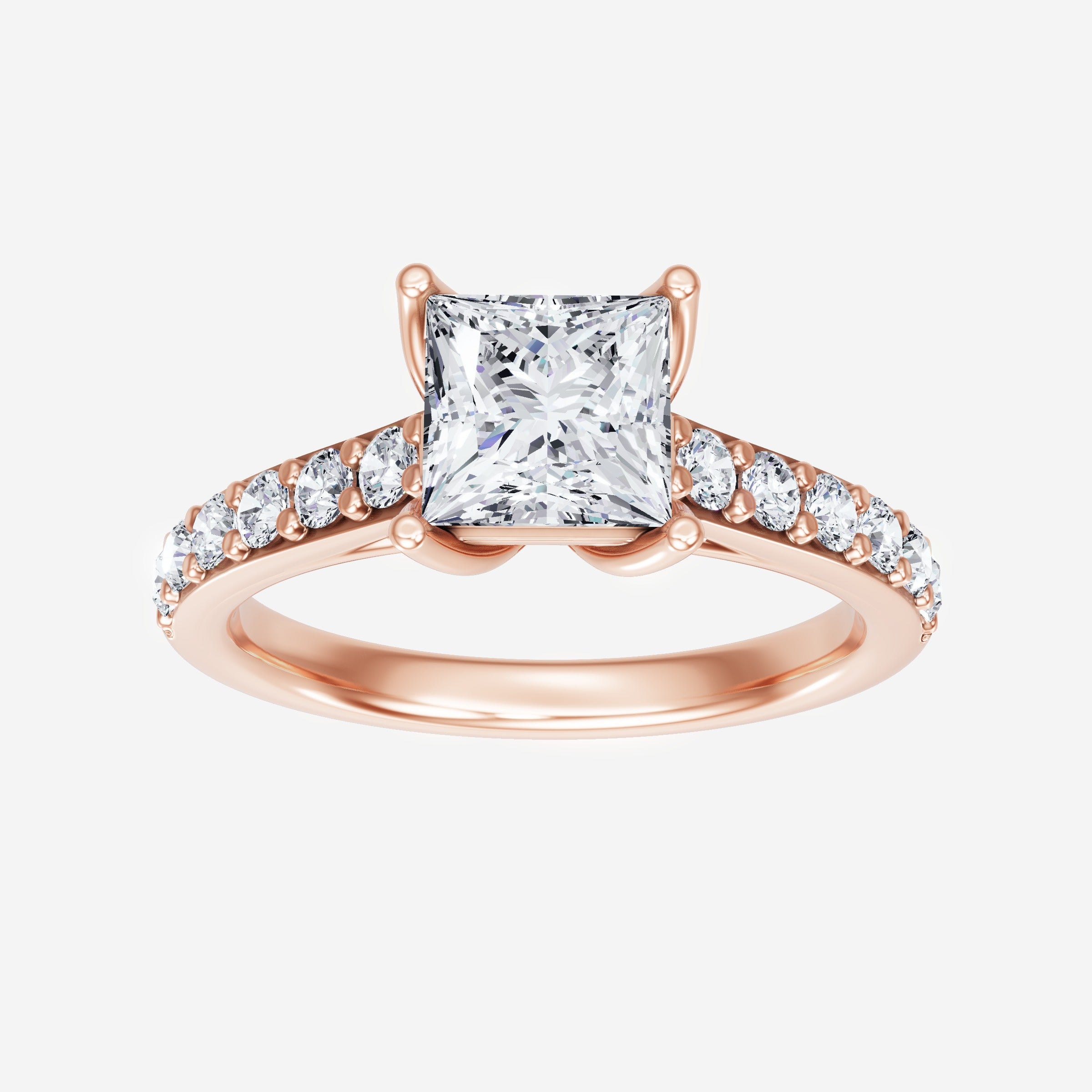 You’ve designed a ring that reflects lasting elegance and grace! Crafted from 14k Rose Gold, this exquisite Princess lab-grown diamond is the centerpiece of this unique design. This Cathedral Diamond Shank with a 4 Prong Flower Head head showcases the brilliance of the Princess diamond, creating a timeless look. A perfect choice to celebrate love, commitment, and everything in between.