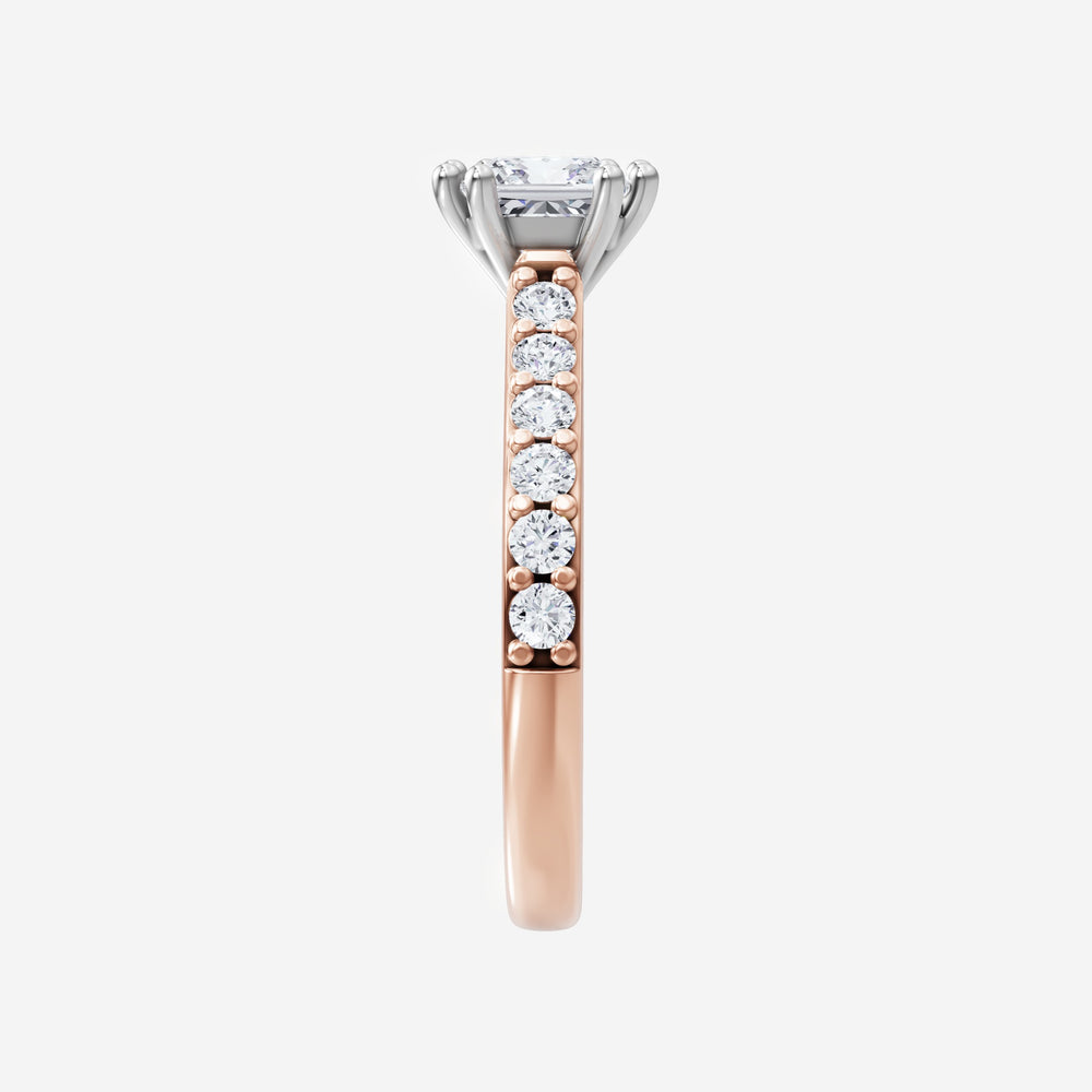 You’ve designed a ring that reflects lasting elegance and grace! Crafted from 14k Rose White Dual Tone, this exquisite Princess lab-grown diamond is the centerpiece of this unique design. This Cathedral Diamond Shank with a 4 Prong Split Prong head showcases the brilliance of the Princess diamond, creating a timeless look. This ring will become a cherished reminder of life's most treasured moments.