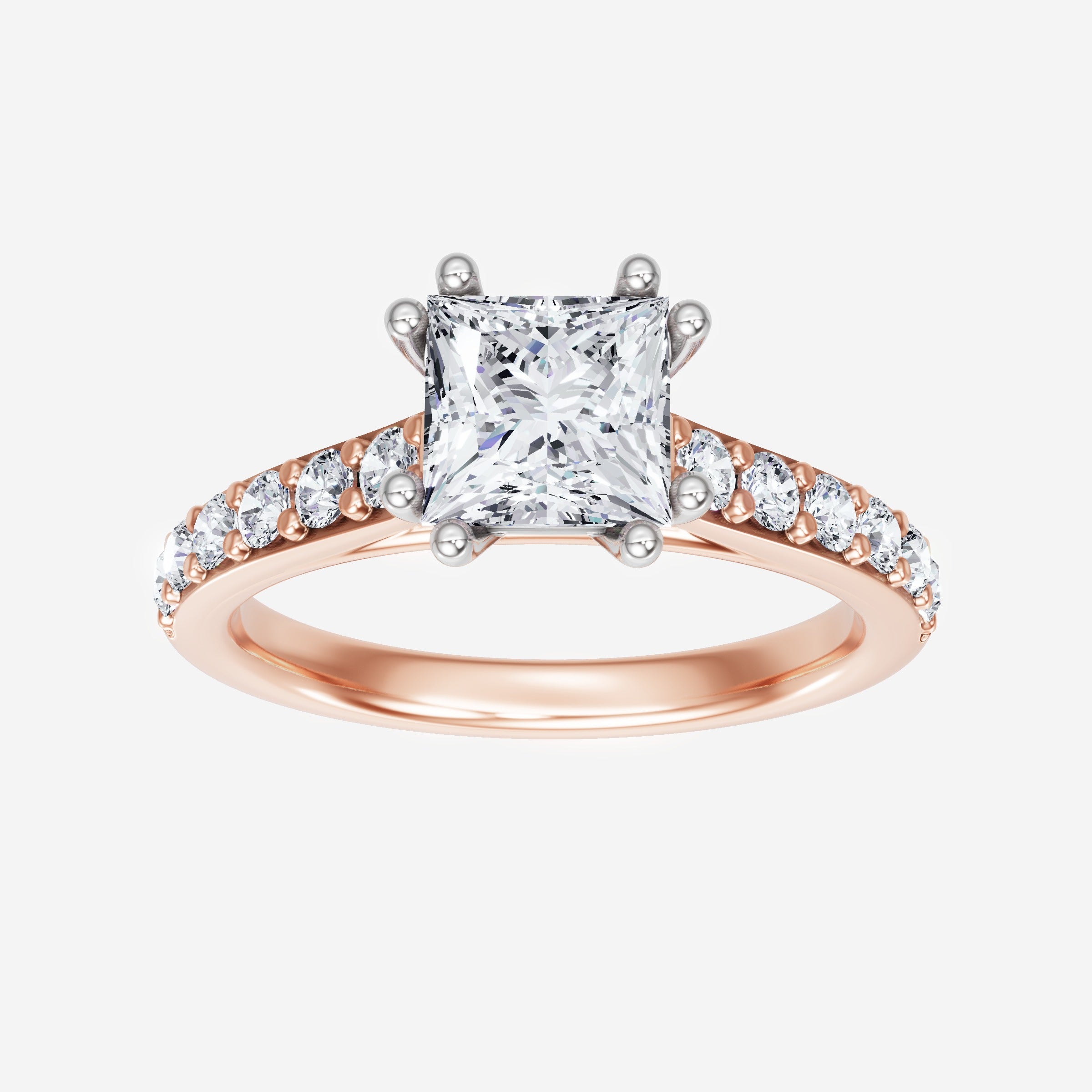 You’ve designed a ring that reflects lasting elegance and grace! Crafted from 14k Rose White Dual Tone, this exquisite Princess lab-grown diamond is the centerpiece of this unique design. This Cathedral Diamond Shank with a 4 Prong Split Prong head showcases the brilliance of the Princess diamond, creating a timeless look. A perfect choice to celebrate love, commitment, and everything in between.