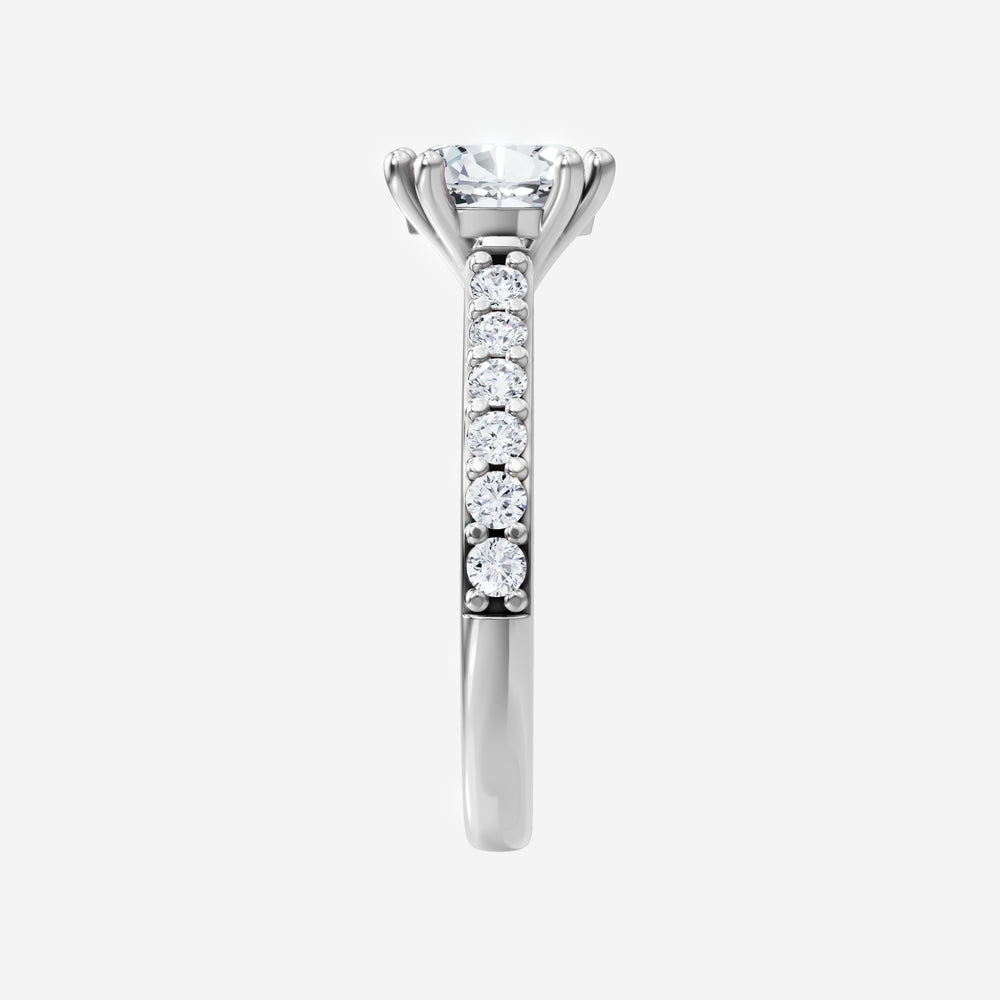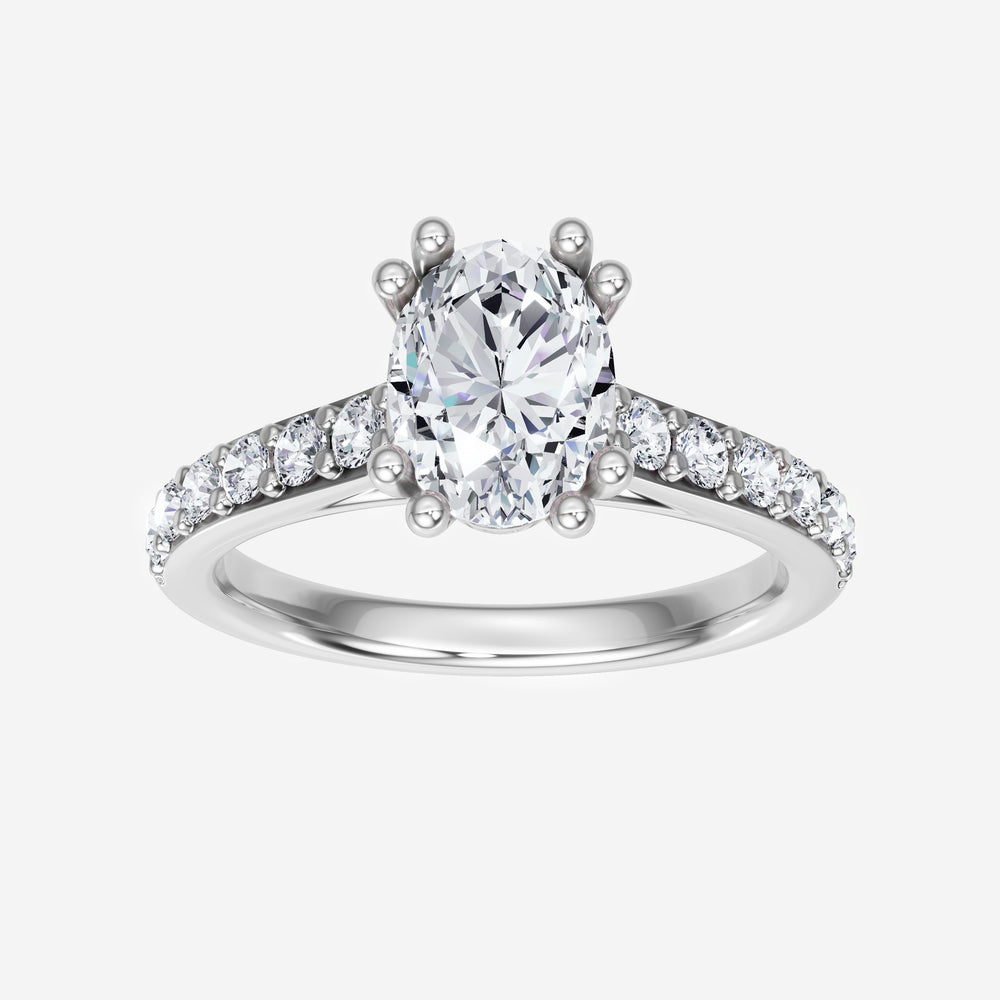 You’ve designed a ring that reflects lasting elegance and grace! Crafted from 14K White Gold, this exquisite Oval lab-grown diamond is the centerpiece of this unique design. This Cathedral Diamond Shank with a 4 Prong Split Prong head showcases the brilliance of the Oval diamond, creating a timeless look. Ideal for those who seek both beauty and meaning, this ring will stand as a testament to cherished memories.