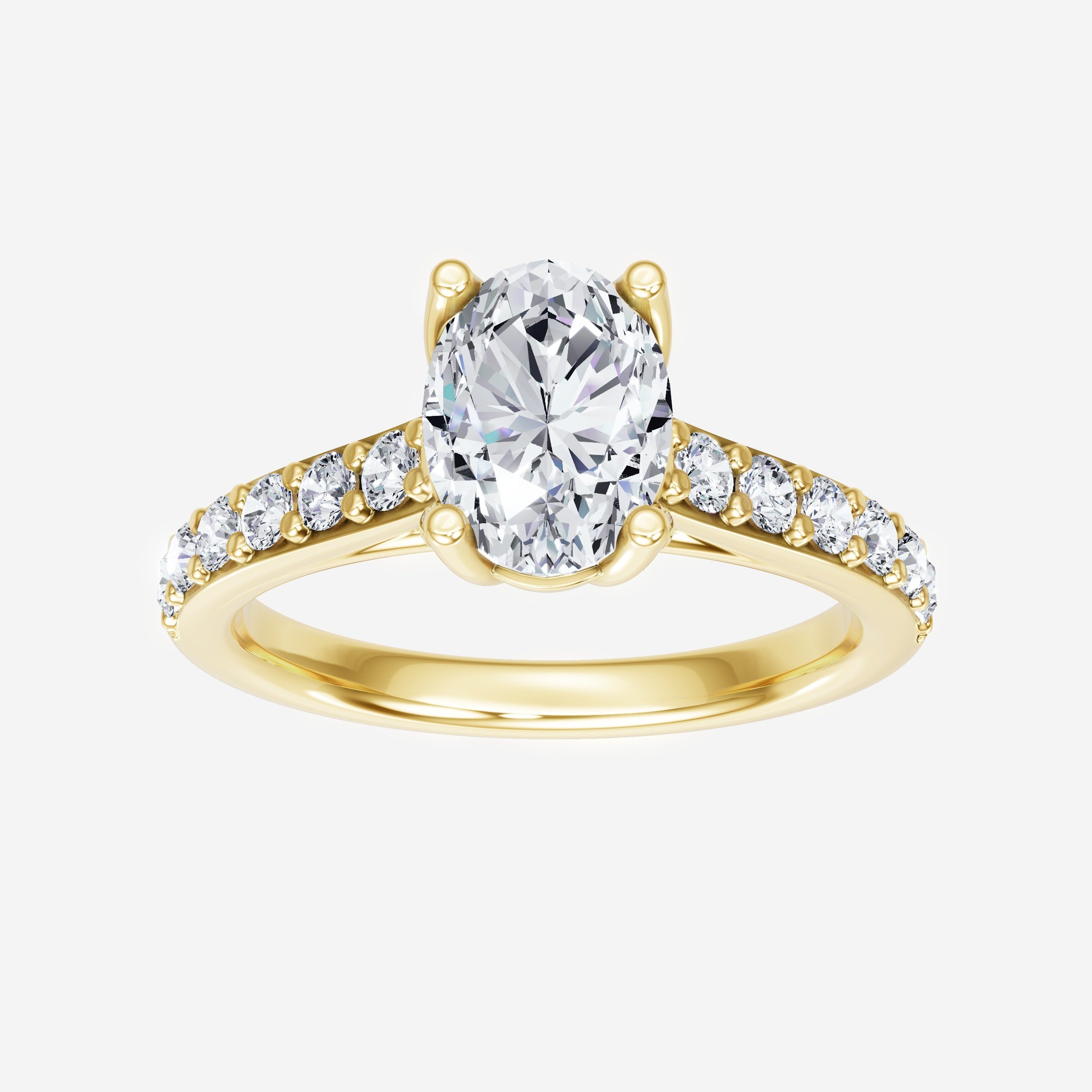 You’ve designed a ring that reflects lasting elegance and grace! Crafted from 14K Yellow Gold, this exquisite Oval lab-grown diamond is the centerpiece of this unique design. This Cathedral Diamond Shank with a 4 Prong Flower Head head showcases the brilliance of the Oval diamond, creating a timeless look. It's a piece of elegance and beauty, perfect for marking life's most beautiful occasions.