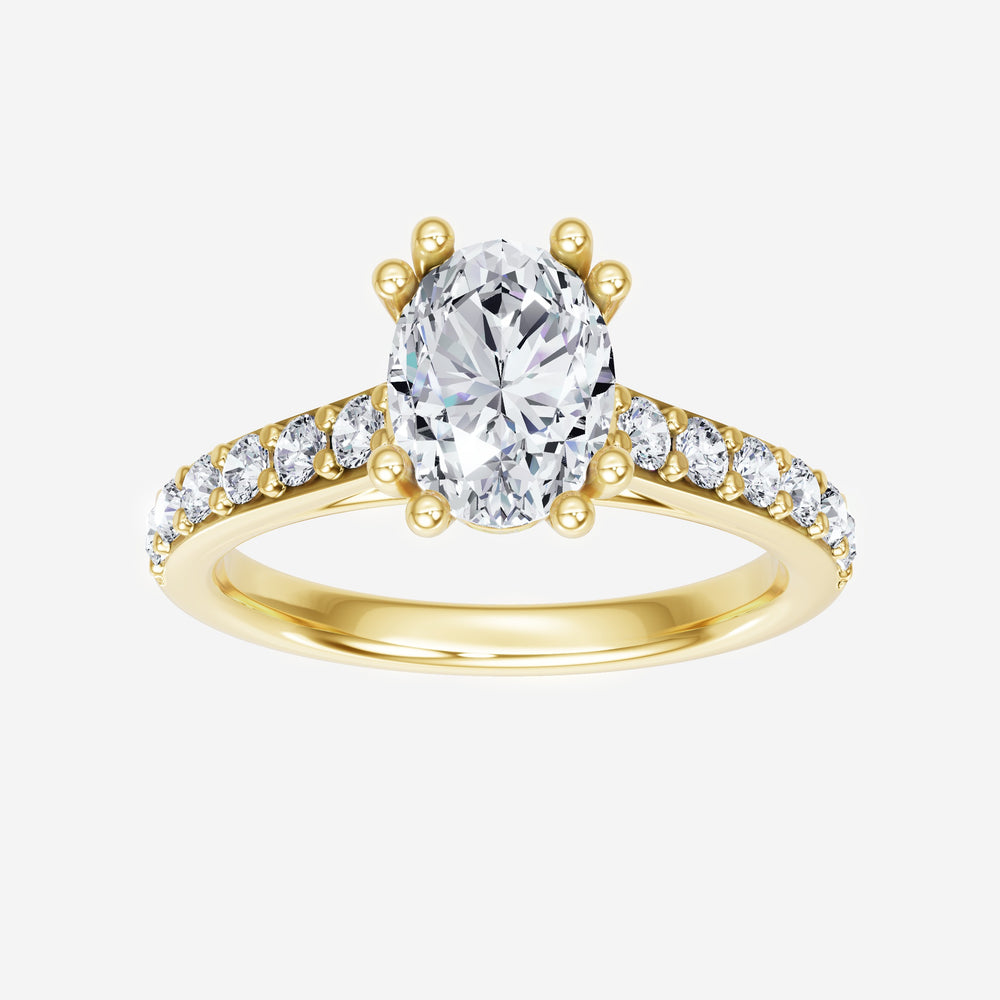 You’ve designed a ring that reflects lasting elegance and grace! Crafted from 14K Yellow Gold, this exquisite Oval lab-grown diamond is the centerpiece of this unique design. This Cathedral Diamond Shank with a 4 Prong Split Prong head showcases the brilliance of the Oval diamond, creating a timeless look. A perfect choice to celebrate love, commitment, and everything in between.