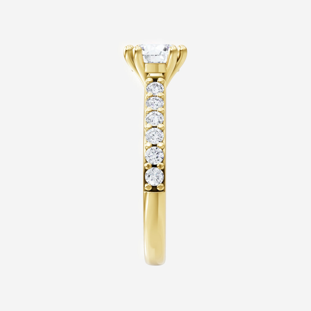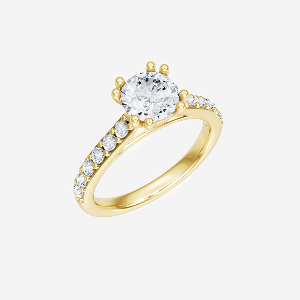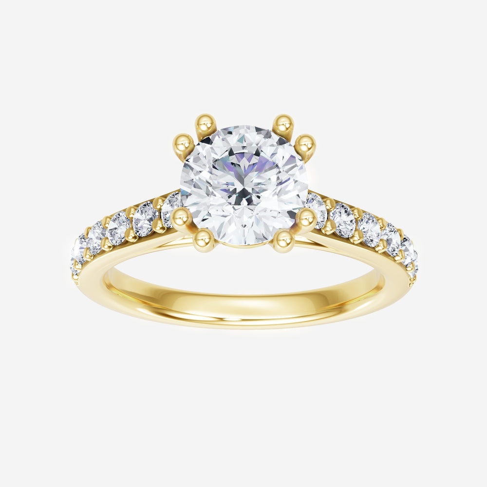 You’ve designed a ring that reflects lasting elegance and grace! Crafted from 14K Yellow Gold, this exquisite Round lab-grown diamond is the centerpiece of this unique design. This Cathedral Diamond Shank with a 4 Prong Split Prong head showcases the brilliance of the Round diamond, creating a timeless look. This elegant piece is the perfect symbol of love, strength, and timeless beauty.