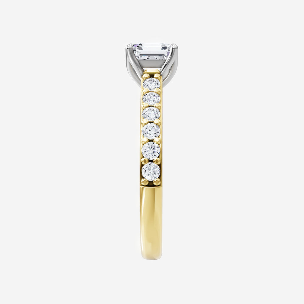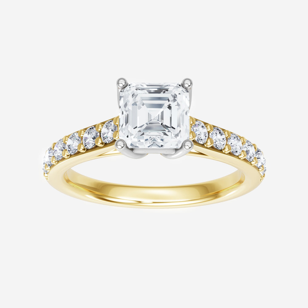 You’ve designed a ring that reflects lasting elegance and grace! Crafted from 14k Yellow White Dual Tone, this exquisite Asscher lab-grown diamond is the centerpiece of this unique design. This Cathedral Diamond Shank with a 4 Prong Flower Head head showcases the brilliance of the Asscher diamond, creating a timeless look. This stunning ring makes the perfect symbol of everlasting love and devotion.