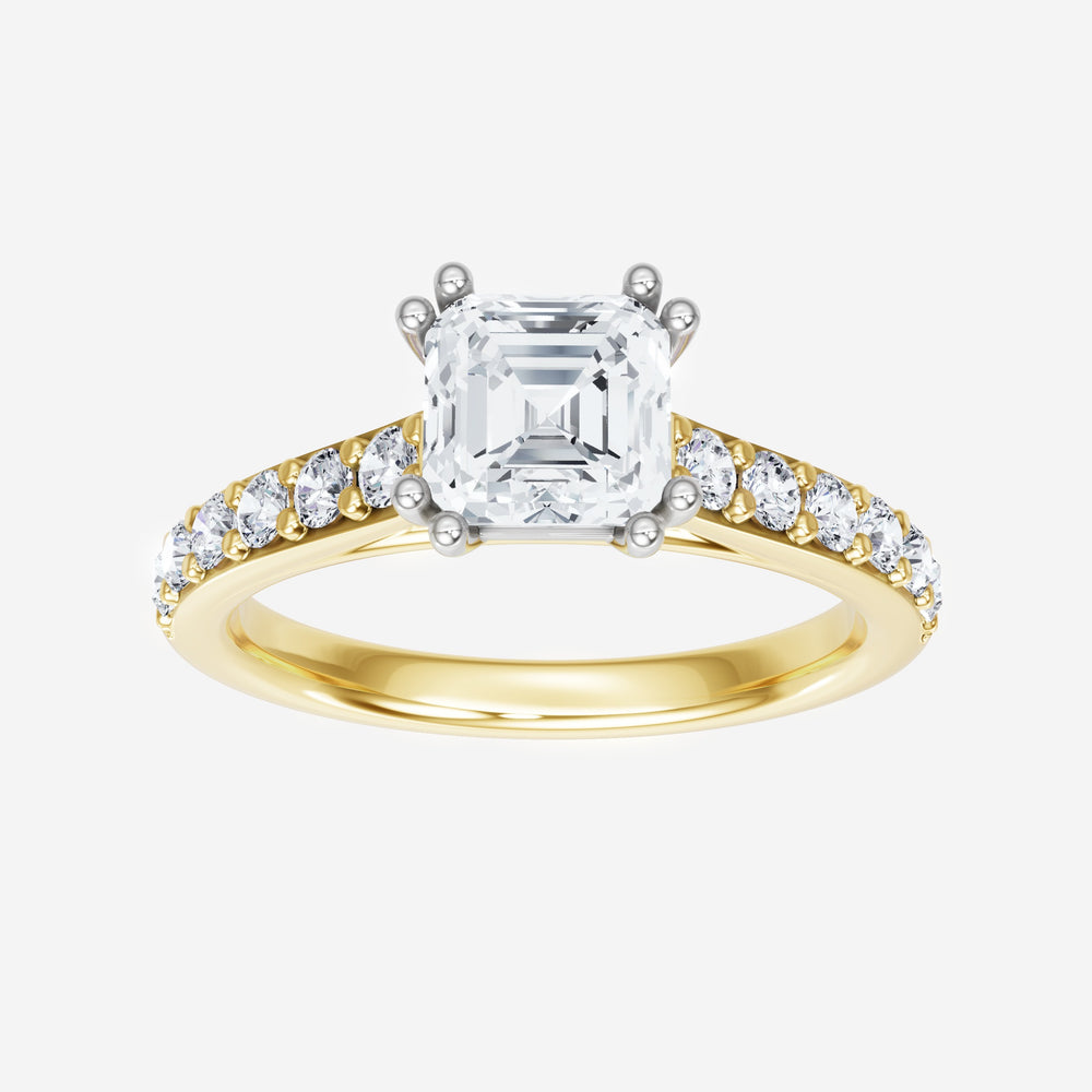 You’ve designed a ring that reflects lasting elegance and grace! Crafted from 14k Yellow White Dual Tone, this exquisite Asscher lab-grown diamond is the centerpiece of this unique design. This Cathedral Diamond Shank with a 4 Prong Split Prong head showcases the brilliance of the Asscher diamond, creating a timeless look. This ring will become a cherished reminder of life's most treasured moments.