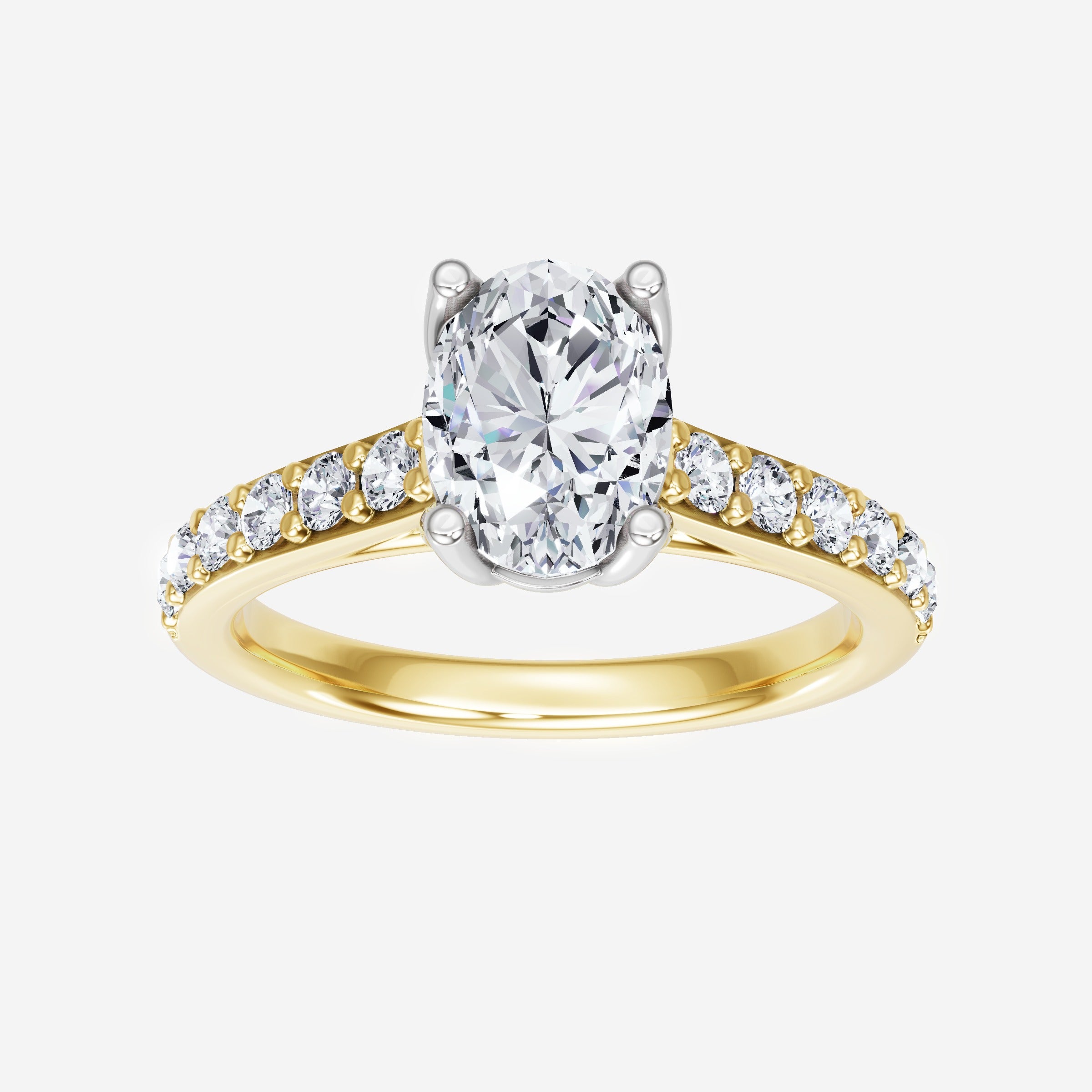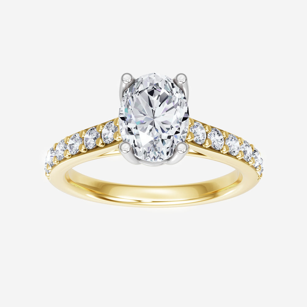 You’ve designed a ring that reflects lasting elegance and grace! Crafted from 14k Yellow White Dual Tone, this exquisite Oval lab-grown diamond is the centerpiece of this unique design. This Cathedral Diamond Shank with a 4 Prong Flower Head head showcases the brilliance of the Oval diamond, creating a timeless look. This ring will become a cherished reminder of life's most treasured moments.