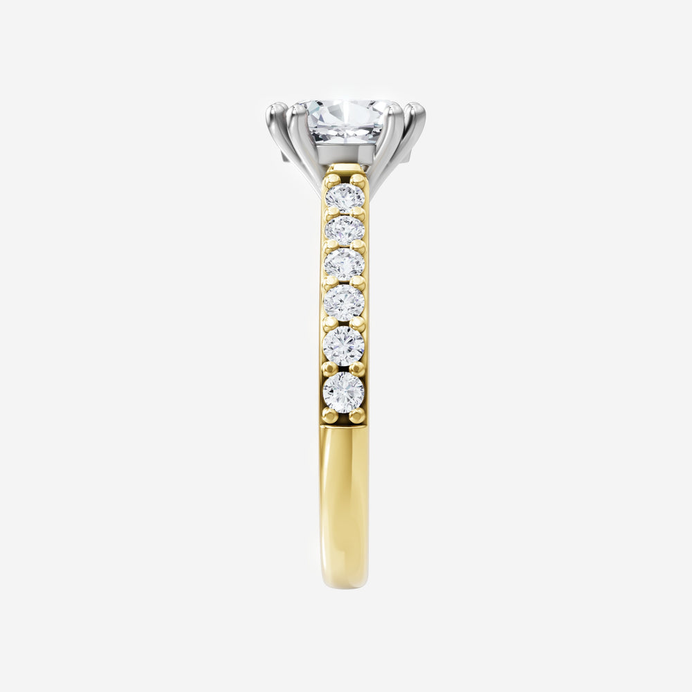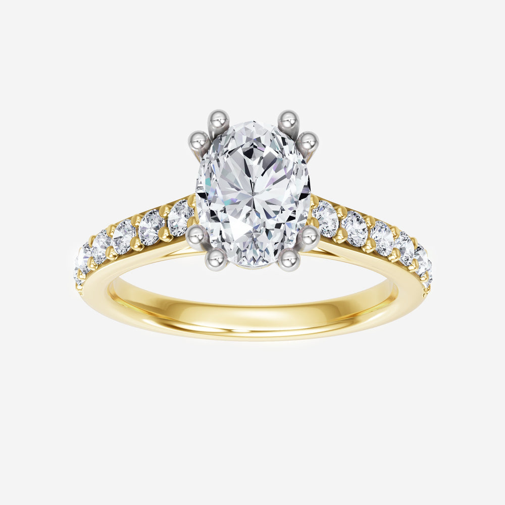 You’ve designed a ring that reflects lasting elegance and grace! Crafted from 14k Yellow White Dual Tone, this exquisite Oval lab-grown diamond is the centerpiece of this unique design. This Cathedral Diamond Shank with a 4 Prong Split Prong head showcases the brilliance of the Oval diamond, creating a timeless look. With this ring, celebrate every moment of joy, success, and love.