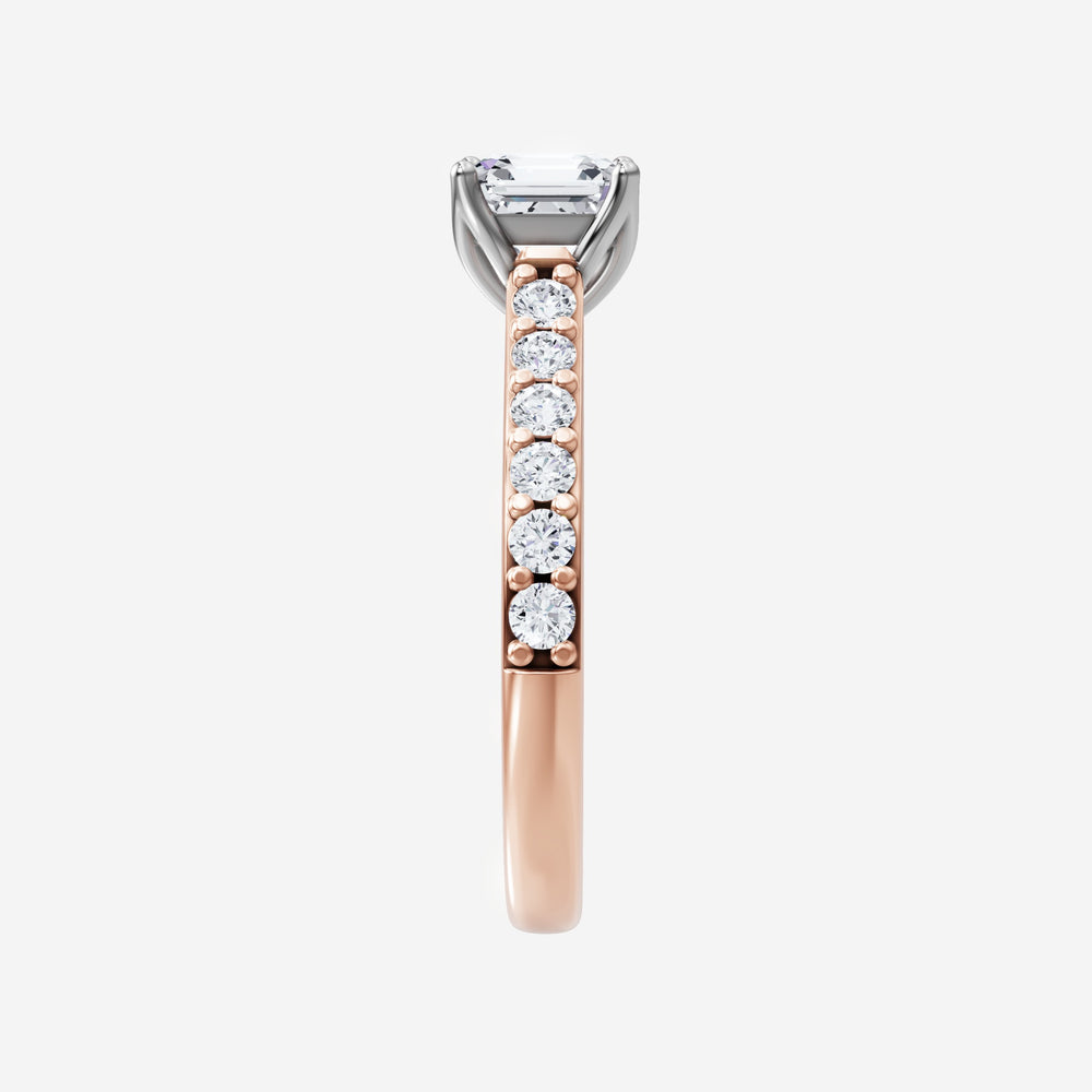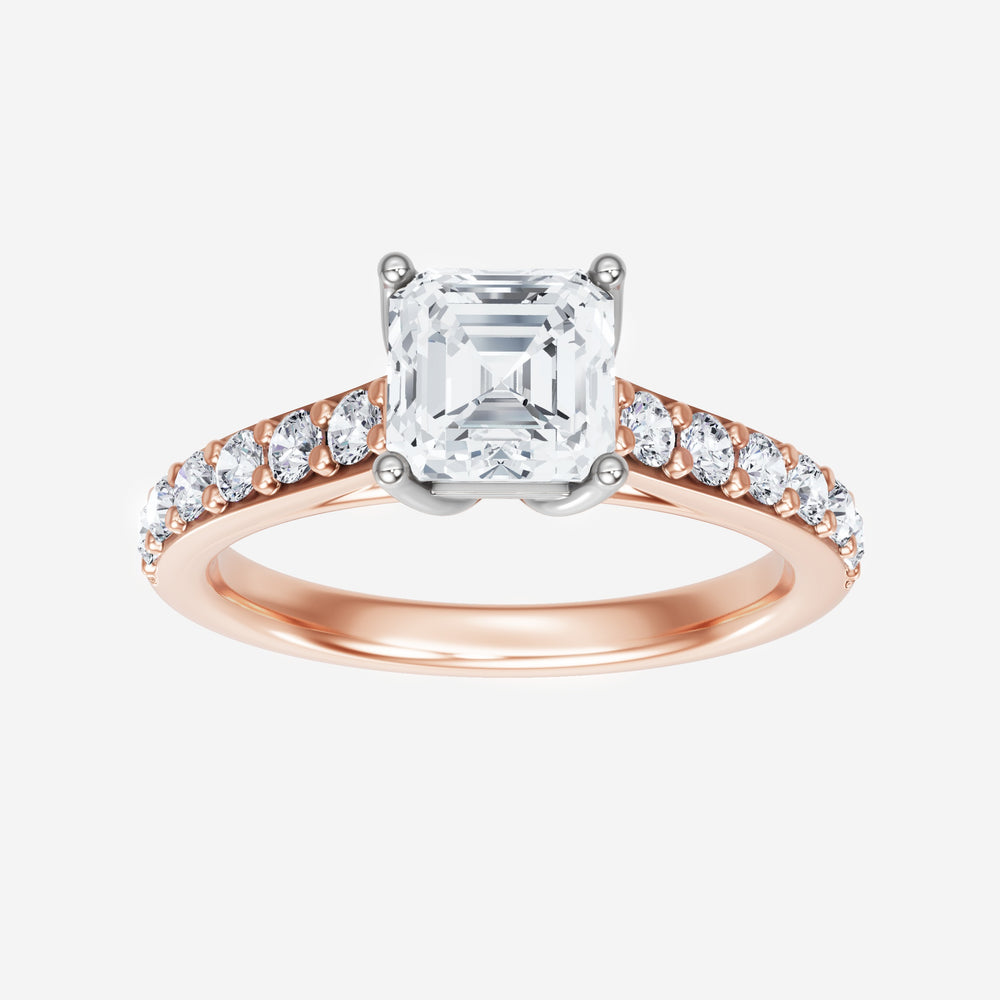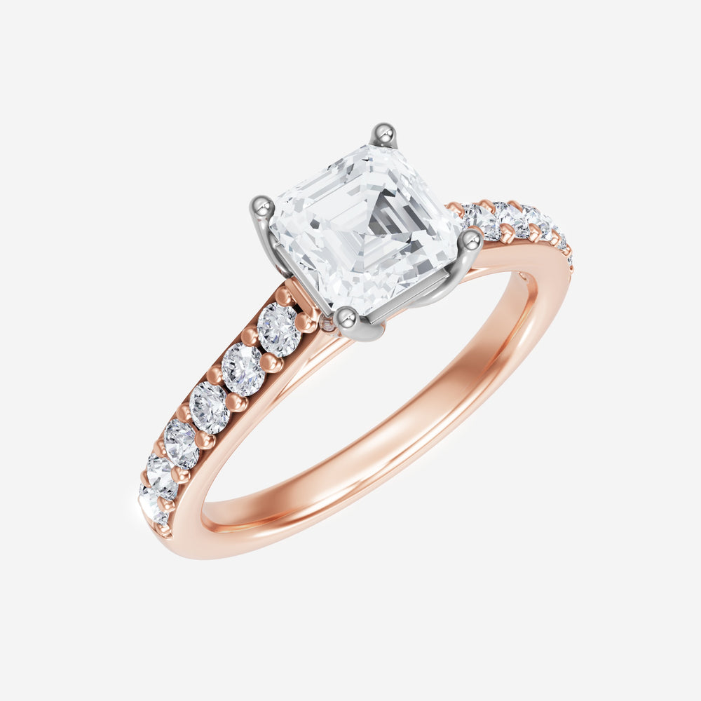 You’ve designed a ring that reflects lasting elegance and grace! Crafted from 18k Rose White Dual Tone, this exquisite Asscher lab-grown diamond is the centerpiece of this unique design. This Cathedral Diamond Shank with a 4 Prong Flower Head head showcases the brilliance of the Asscher diamond, creating a timeless look. With this ring, celebrate every moment of joy, success, and love.