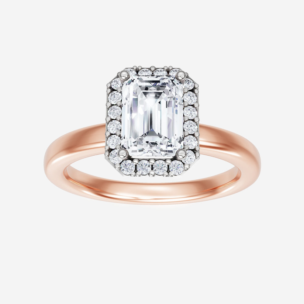 You’ve designed a ring that reflects lasting elegance and grace! Crafted from 18k Rose White Dual Tone, this exquisite Emerald lab-grown diamond is the centerpiece of this unique design. This Basic Plain Shank with a Single Halo head showcases the brilliance of the Emerald diamond, creating a timeless look. This ring will become a cherished reminder of life's most treasured moments.