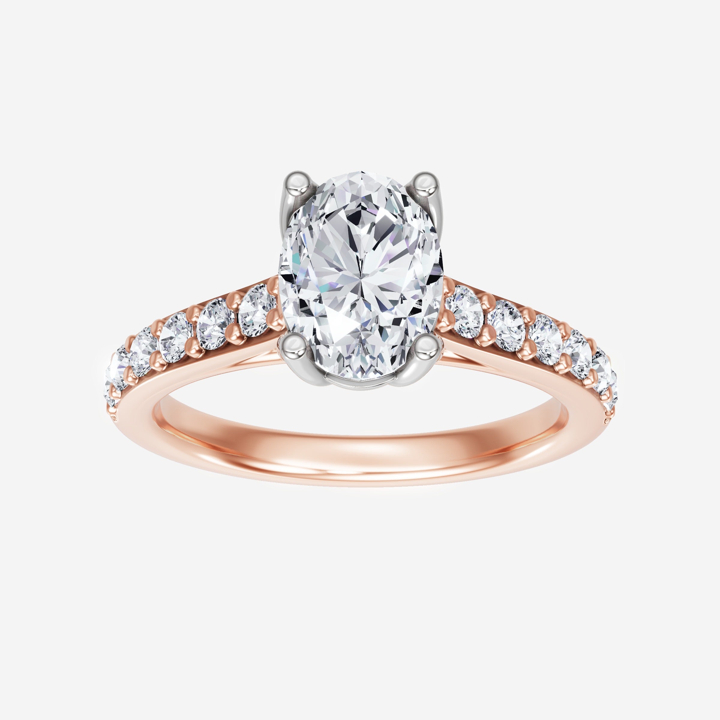You’ve designed a ring that reflects lasting elegance and grace! Crafted from 18k Rose White Dual Tone, this exquisite Oval lab-grown diamond is the centerpiece of this unique design. This Cathedral Diamond Shank with a 4 Prong Flower Head head showcases the brilliance of the Oval diamond, creating a timeless look. Ideal for those who seek both beauty and meaning, this ring will stand as a testament to cherished memories.