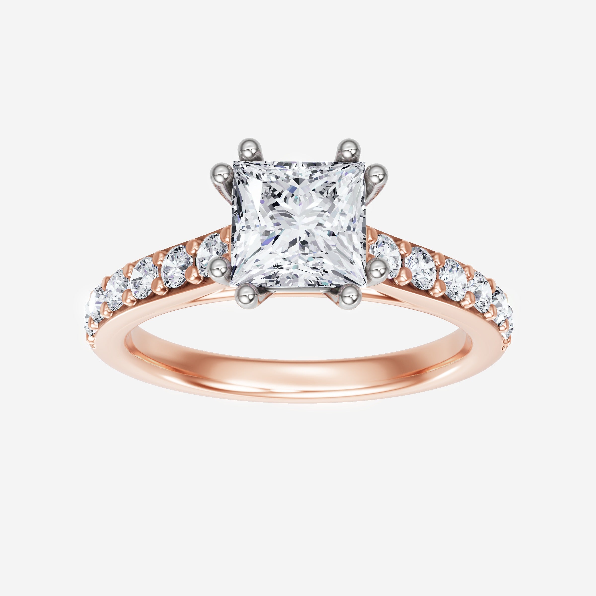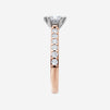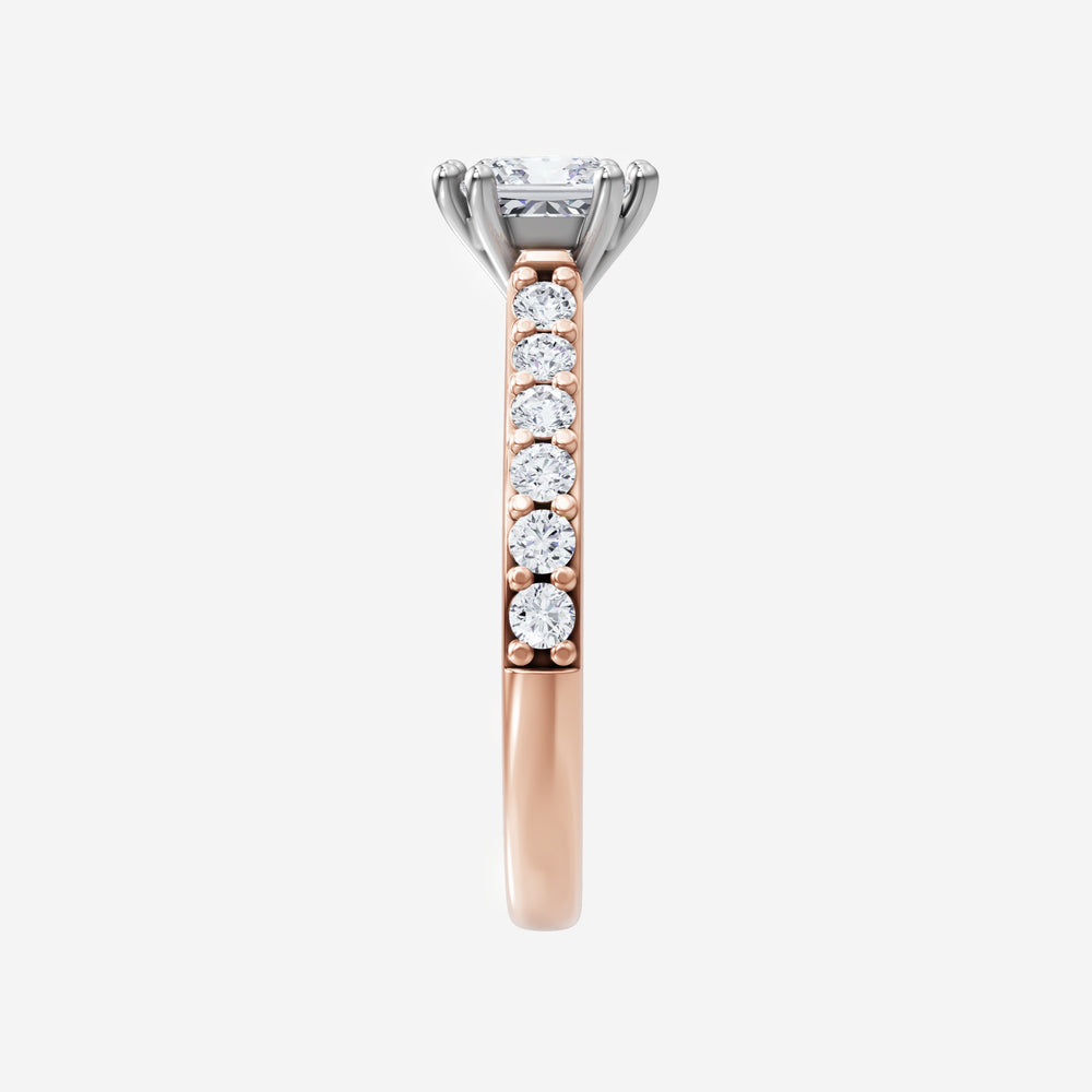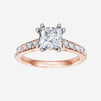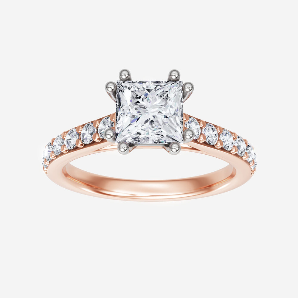 You’ve designed a ring that reflects lasting elegance and grace! Crafted from 18k Rose White Dual Tone, this exquisite Princess lab-grown diamond is the centerpiece of this unique design. This Cathedral Diamond Shank with a 4 Prong Split Prong head showcases the brilliance of the Princess diamond, creating a timeless look. This stunning ring makes the perfect symbol of everlasting love and devotion.