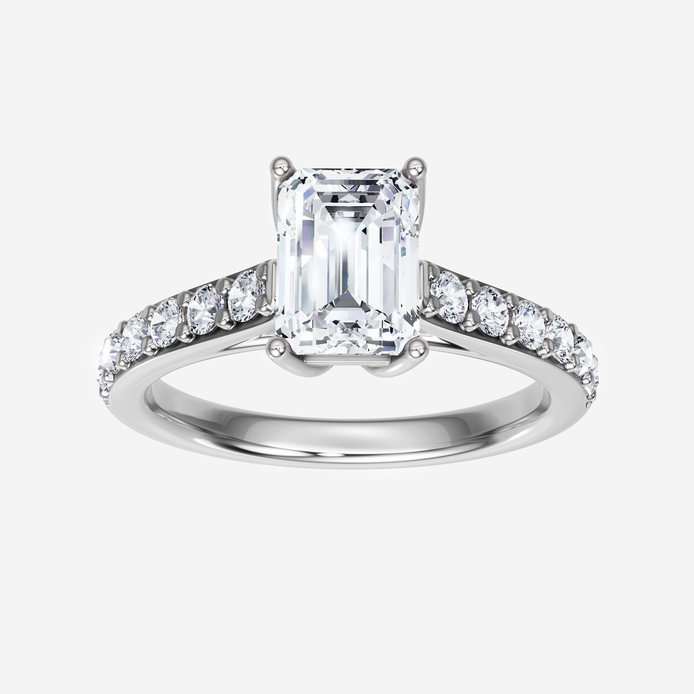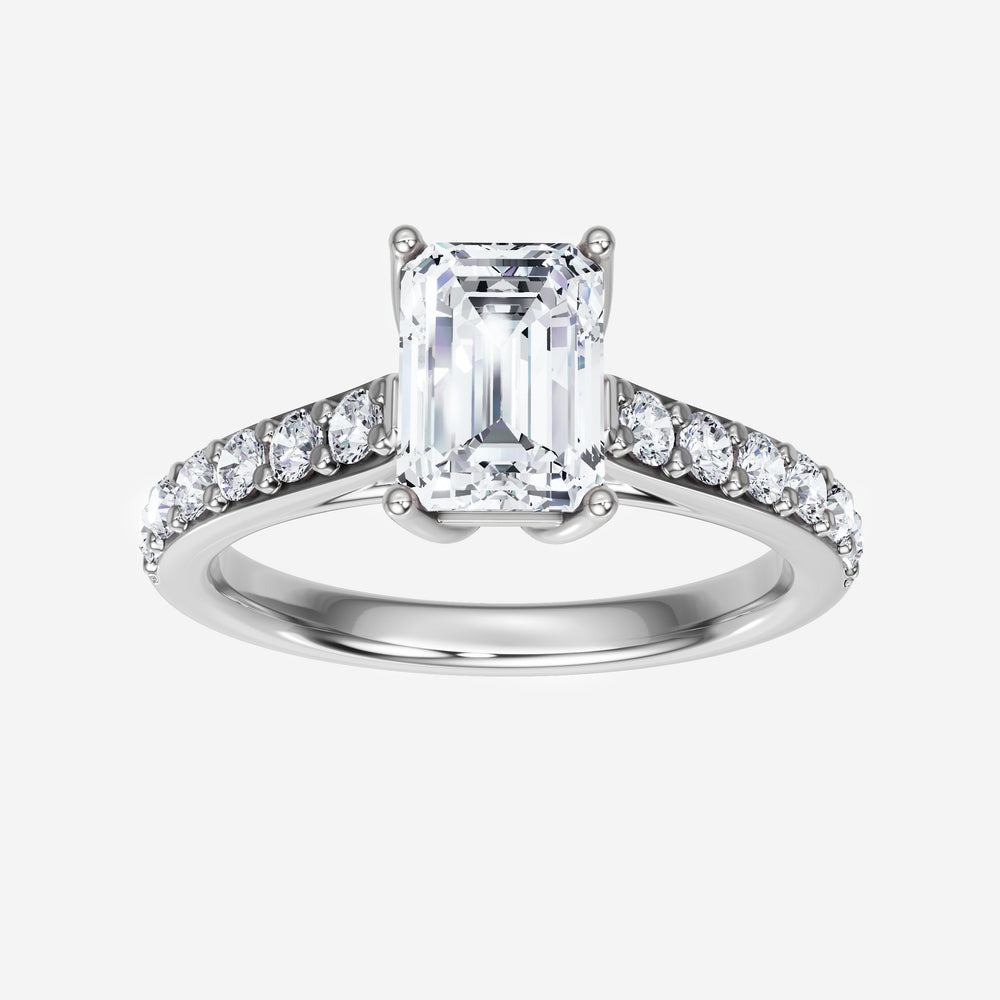 You’ve designed a ring that reflects lasting elegance and grace! Crafted from 18K White Gold, this exquisite Emerald lab-grown diamond is the centerpiece of this unique design. This Cathedral Diamond Shank with a 4 Prong Flower Head head showcases the brilliance of the Emerald diamond, creating a timeless look. This elegant piece is the perfect symbol of love, strength, and timeless beauty.