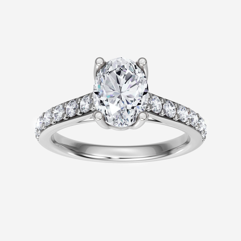You’ve designed a ring that reflects lasting elegance and grace! Crafted from 18K White Gold, this exquisite Oval lab-grown diamond is the centerpiece of this unique design. This Cathedral Diamond Shank with a 4 Prong Flower Head head showcases the brilliance of the Oval diamond, creating a timeless look. This elegant piece is the perfect symbol of love, strength, and timeless beauty.