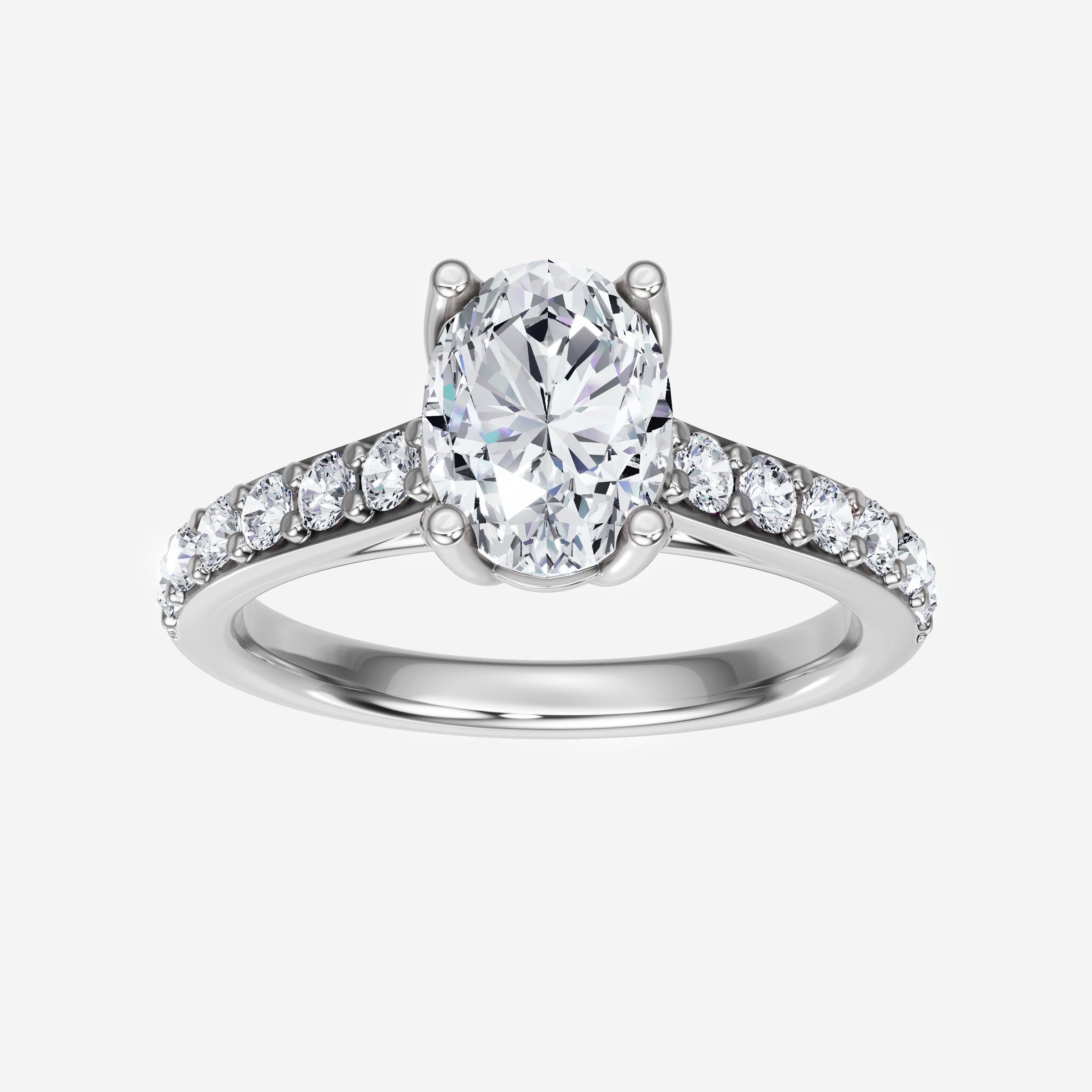 You’ve designed a ring that reflects lasting elegance and grace! Crafted from 18K White Gold, this exquisite Oval lab-grown diamond is the centerpiece of this unique design. This Cathedral Diamond Shank with a 4 Prong Flower Head head showcases the brilliance of the Oval diamond, creating a timeless look. This stunning ring makes the perfect symbol of everlasting love and devotion.