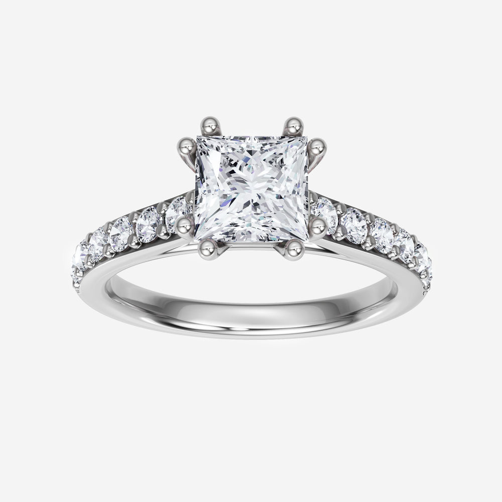 You’ve designed a ring that reflects lasting elegance and grace! Crafted from 18K White Gold, this exquisite Princess lab-grown diamond is the centerpiece of this unique design. This Cathedral Diamond Shank with a 4 Prong Split Prong head showcases the brilliance of the Princess diamond, creating a timeless look. A perfect choice to celebrate love, commitment, and everything in between.
