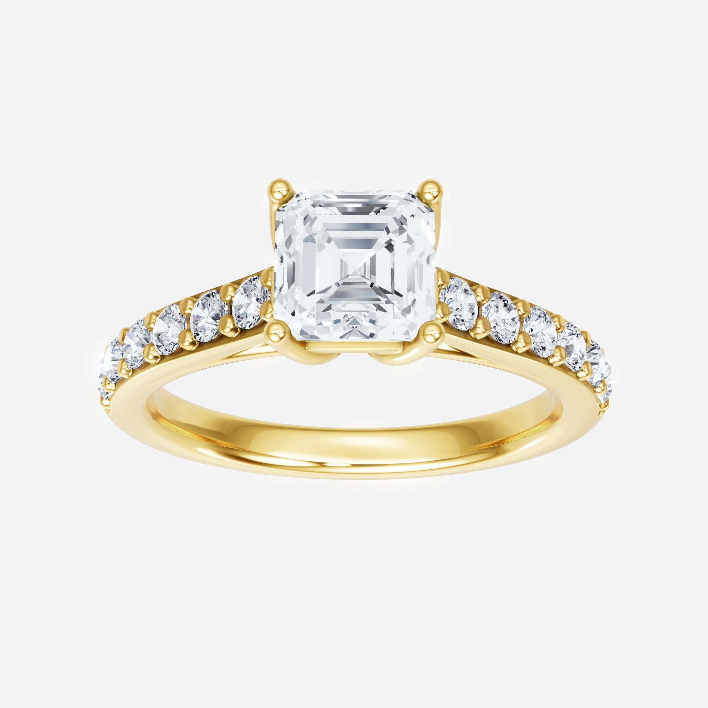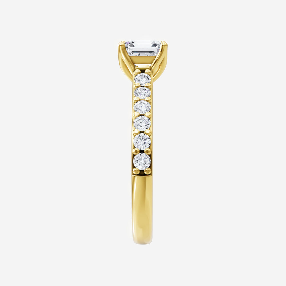 You’ve designed a ring that reflects lasting elegance and grace! Crafted from 18K Yellow Gold, this exquisite Asscher lab-grown diamond is the centerpiece of this unique design. This Cathedral Diamond Shank with a 4 Prong Flower Head head showcases the brilliance of the Asscher diamond, creating a timeless look. Ideal for those who seek both beauty and meaning, this ring will stand as a testament to cherished memories.