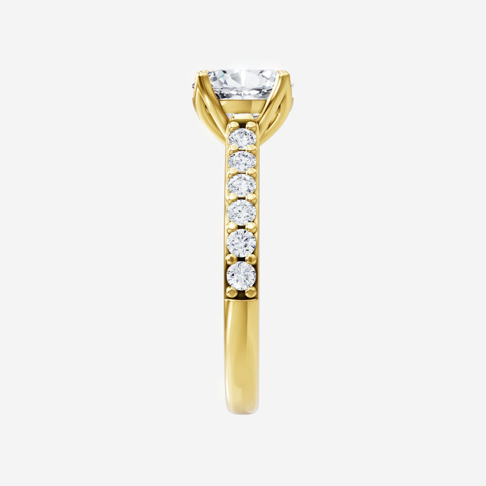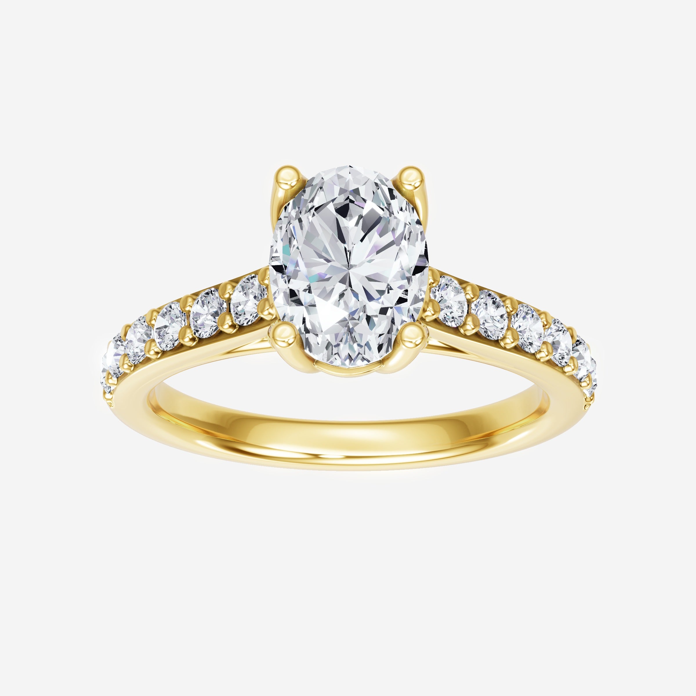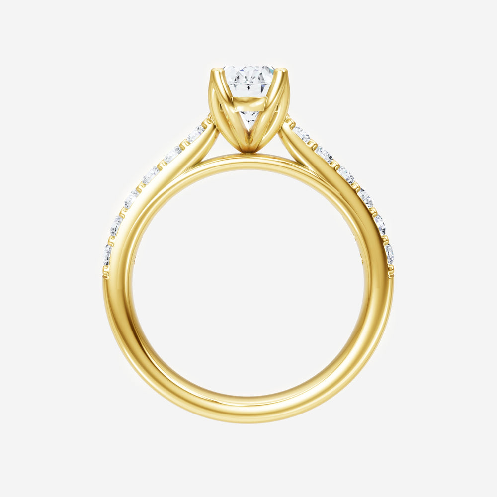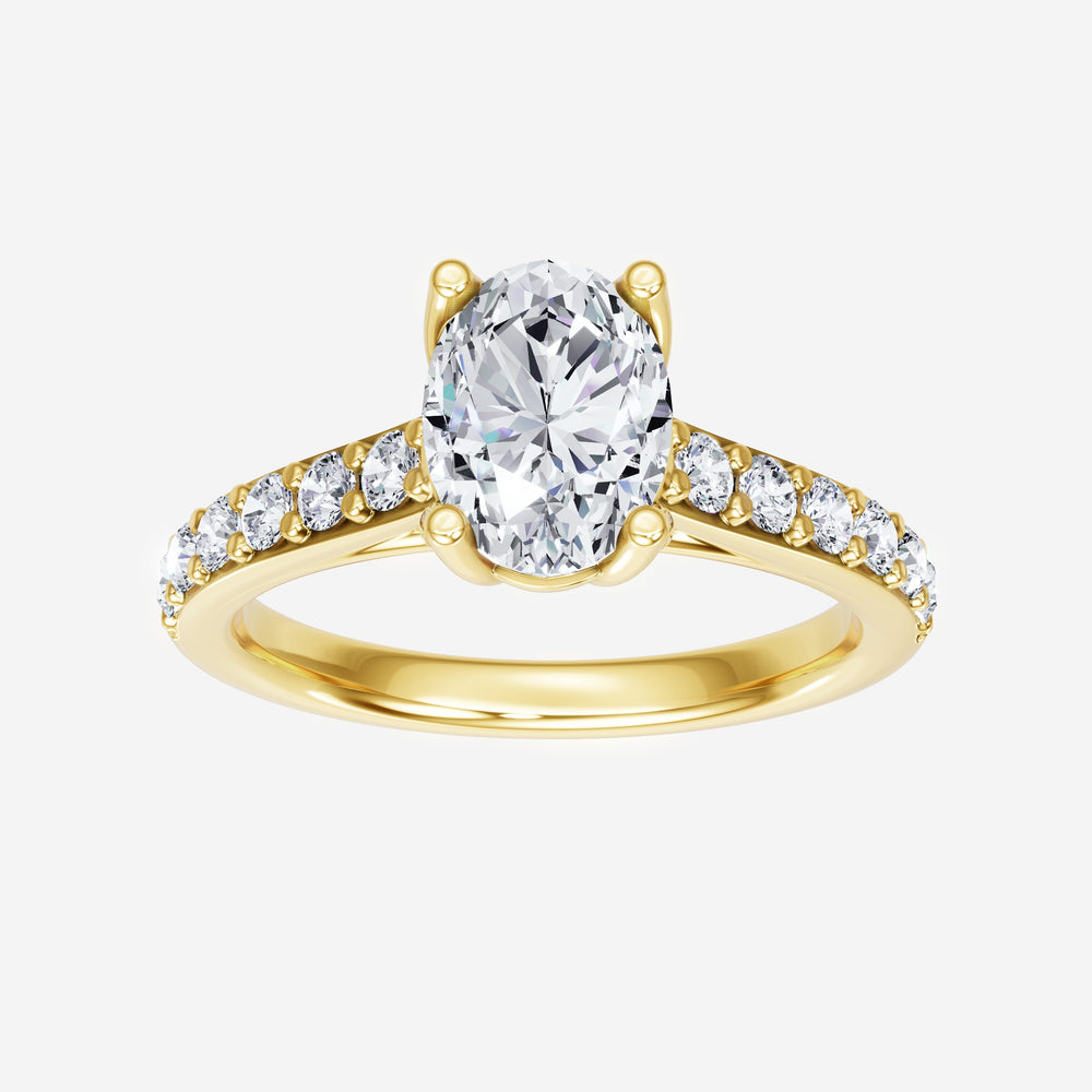 You’ve designed a ring that reflects lasting elegance and grace! Crafted from 18K Yellow Gold, this exquisite Oval lab-grown diamond is the centerpiece of this unique design. This Cathedral Diamond Shank with a 4 Prong Flower Head head showcases the brilliance of the Oval diamond, creating a timeless look. This elegant piece is the perfect symbol of love, strength, and timeless beauty.