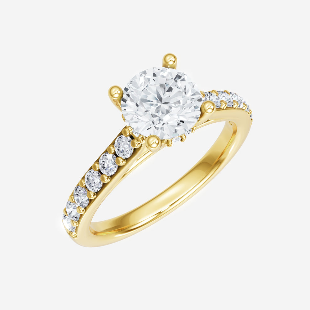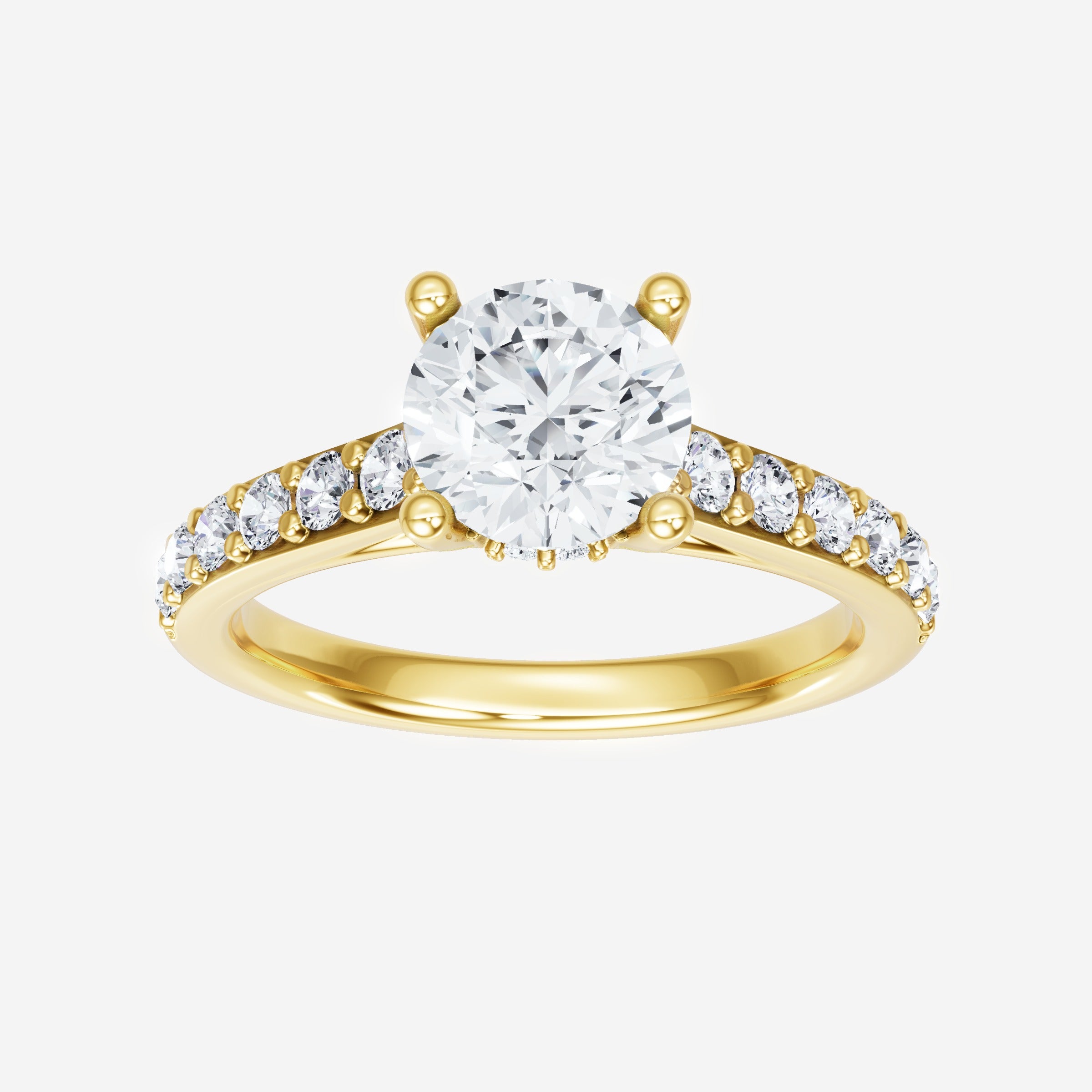 You’ve designed a ring that reflects lasting elegance and grace! Crafted from 18K Yellow Gold, this exquisite Round lab-grown diamond is the centerpiece of this unique design. This Cathedral Diamond Shank with a Hidden Halo head showcases the brilliance of the Round diamond, creating a timeless look. This elegant piece is the perfect symbol of love, strength, and timeless beauty.