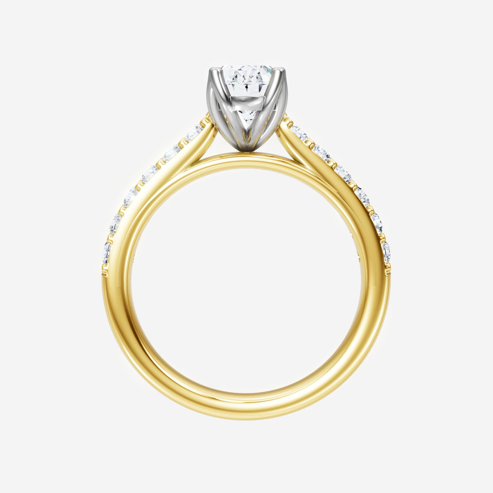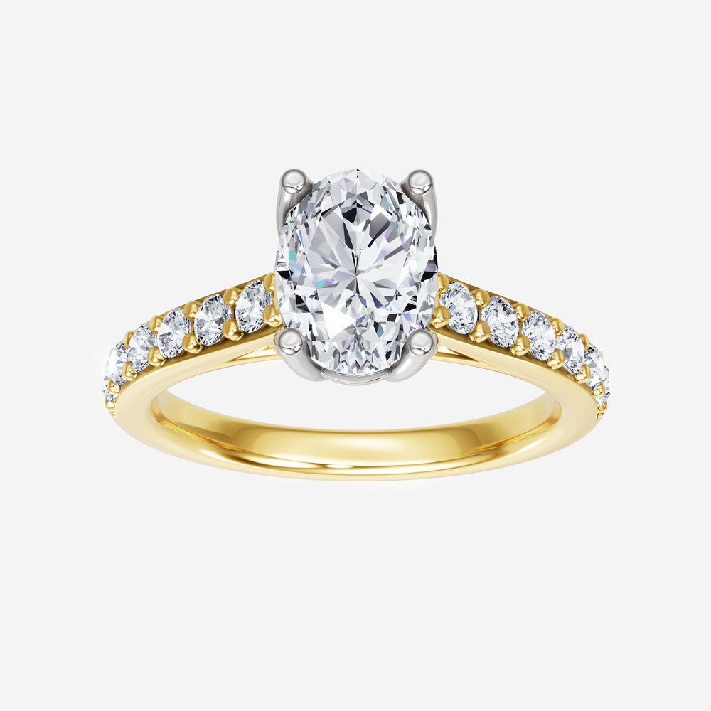 You’ve designed a ring that reflects lasting elegance and grace! Crafted from 18k Yellow White Dual Tone, this exquisite Oval lab-grown diamond is the centerpiece of this unique design. This Cathedral Diamond Shank with a 4 Prong Flower Head head showcases the brilliance of the Oval diamond, creating a timeless look. A perfect choice to celebrate love, commitment, and everything in between.